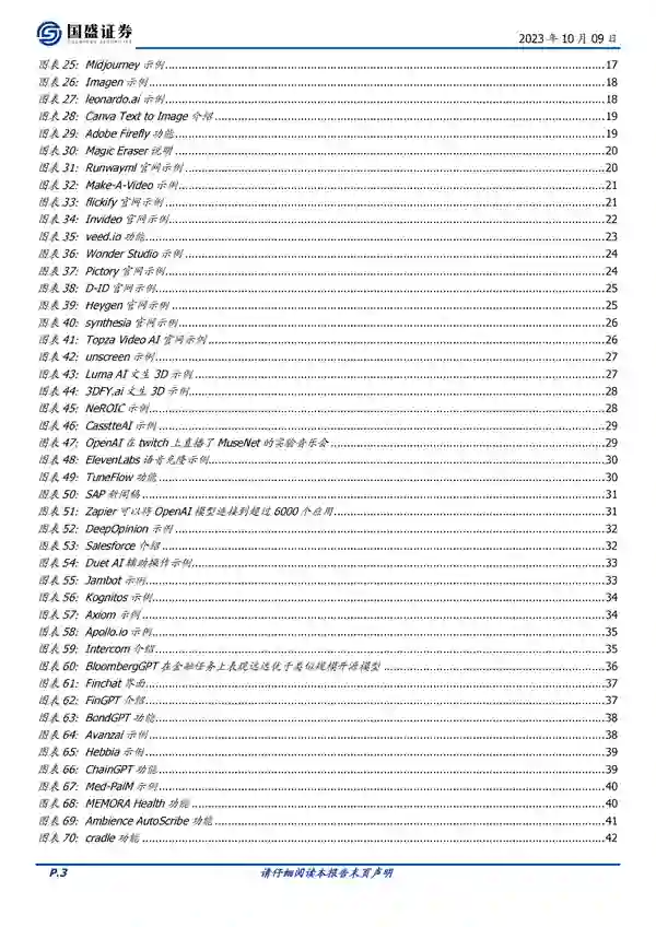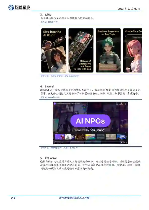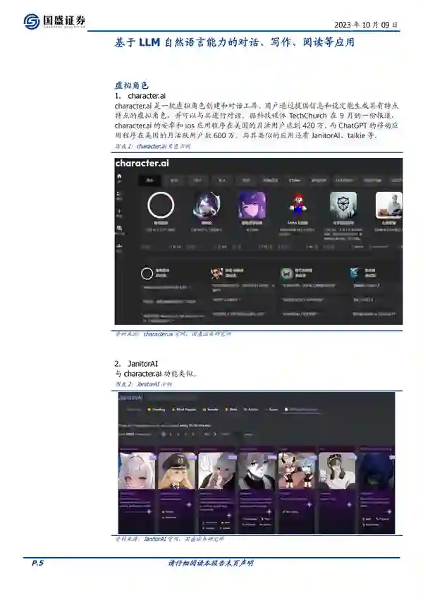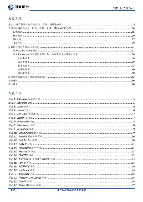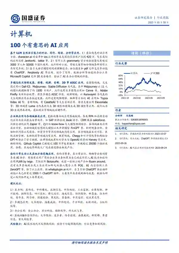 来源:国盛证券 去年11月,ChatGPT的“一夜爆火”在全球掀起了 “AI风暴”,无数高科技公司纷纷涌入这一领域开展“军备竞赛”。接近一年的时间,有哪些AI应用跑出来了?有哪些新公司已经“初露锋芒”?下一个“大赢家”又会“花落谁家”? 国盛证券整理了100个有意思的AI应用,涉及各领域,各方面。这100个有意思的应用在于它们利用人工智能技术,为用户提供了各种有趣、实用的功能和服务。它们可以在日常生活中帮助我们规划旅行、烹饪食物,还可以提供写作、阅读、分析等方面的辅助工具。此外,这些应用还涵盖了多个领域,包括金融、医疗、教育、法律等,为不同行业提供了解决方案和工具。总的来说,这些应用的有意思之处在于它们利用人工智能技术,为用户带来了更便捷、智能化的体验。 基于 LLM 自然语言能力的对话、写作、阅读、分析等应用