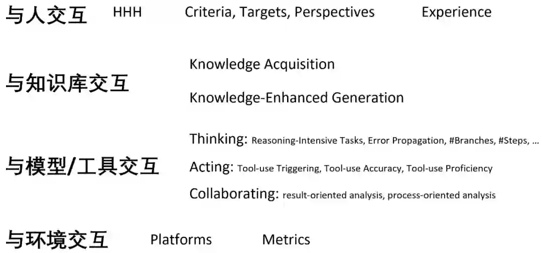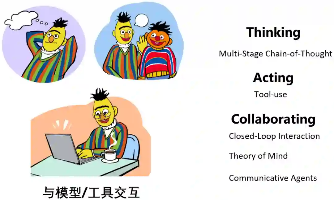 Thinking: 模型与自己本身进行交互,进行任务的分解以及推理等; 1. Acting:模型调用其他的模型,或者外部工具等,帮助进行推理,或者对外部世界产生实际作用; 1. Collaborating: 多个语言模型智能体互相沟通、协作,完成特定的任务,或者模拟人类的社会行为。