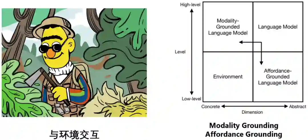 语言模型和环境属于两个不同的象限:语言模型建立在抽象的文字符号之上,擅长 high-level 的推理、规划、决策等任务;而环境建立在具体的感知信号之上(如视觉信息、听觉信息等),模拟或者自然发生一些 low-level 的任务,如提供观察 (observation)、反馈 (feedback)、状态更新 (state transition) 等(如:现实世界中一个苹果落到了地上,模拟引擎中一个 “苦力怕” 出现在了你的面前)。
