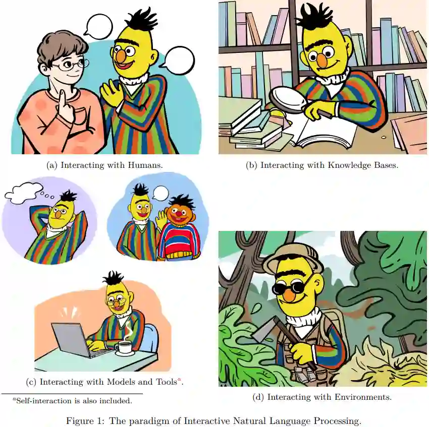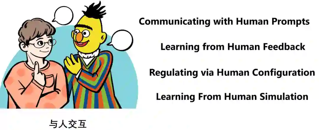 LM 与人类交互,以更好地理解和满足用户需求,个性化回应,与人类价值观对齐 (alignment),并改善整体用户体验; 1. LM 与知识库交互,以丰富语言表达的事实知识,增强回应的知识背景相关性,并动态利用外部信息生成更准确的回应; 1. LM 与模型和工具交互,以有效分解和解决复杂推理任务,利用特定知识处理特定子任务,并促进智能体社会行为的涌现; 1. LM 与环境交互,以学习基于语言的实体表征(language grounding),并有效地处理类似推理、规划和决策等与环境观察相关的具身任务(embodied tasks)。
