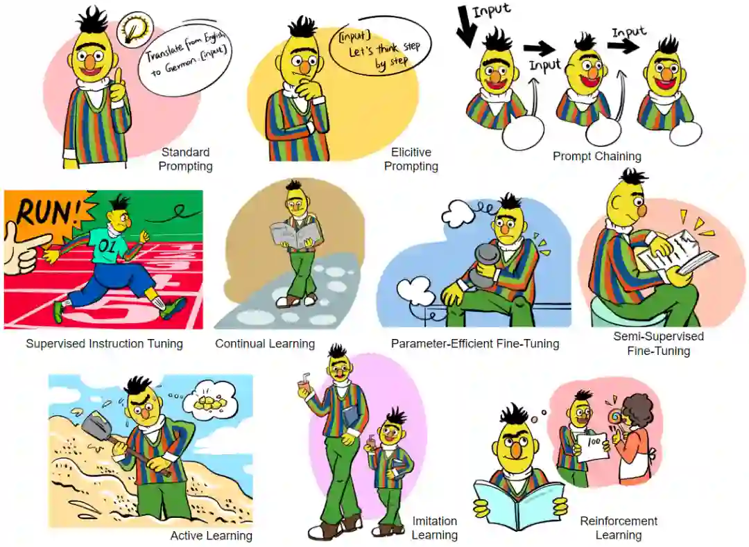 Prompting: 不调整模型参数,仅仅通过 prompt engineering 的方式调用语言模型,涵盖了上下文学习(In-Context Learning)、思维链提示 (Chain of Thought)、工具使用提示 (Tool-use)、级联推理链 (Prompt Chaining) 等多种方法,详细讨论了各种 Prompting 技巧的原理、作用、各种 trick 和局限等,比如在可控性和鲁棒性上的考虑等。 1. Fine-Tuning: 进行模型参数的调整,以让模型从交互信息中进行学习更新。本节涵盖了监督指令精调 (Supervised Instruction Tuning)、参数高效精调 (Parameter-Efficient Fine-Tuning)、持续学习 (Continual Learning)、半监督学习 (Semi-Supervised Fine-Tuning) 等方法。详细讨论了这些方法的原理、作用、优势、在具体使用时的考虑、及其局限。其中还包括了部分 Knowledge Editing 的内容(即编辑模型内部的知识)。 1. Active Learning: 交互式的主动学习算法框架。 1. Reinforcement Learning: 交互式的强化学习算法框架,讨论了在线强化学习框架、离线强化学习框架、从人类反馈中学习(RLHF)、从环境反馈中学习(RLEF)、从 AI 反馈中学习 (RLAIF) 等多种方法。 1. Imitation Learning: 交互式的模仿学习算法框架,讨论了在线模仿学习、离线模仿学习等。 1. Interaction Message Fusion: 为上述所有交互方法提供了一个统一的框架,同时在这个框架中,向外扩展,讨论了不同的知识、信息融合方案,比如跨注意力融合方案 (cross-attention)、约束解码融合方案 (constrained decoding) 等。