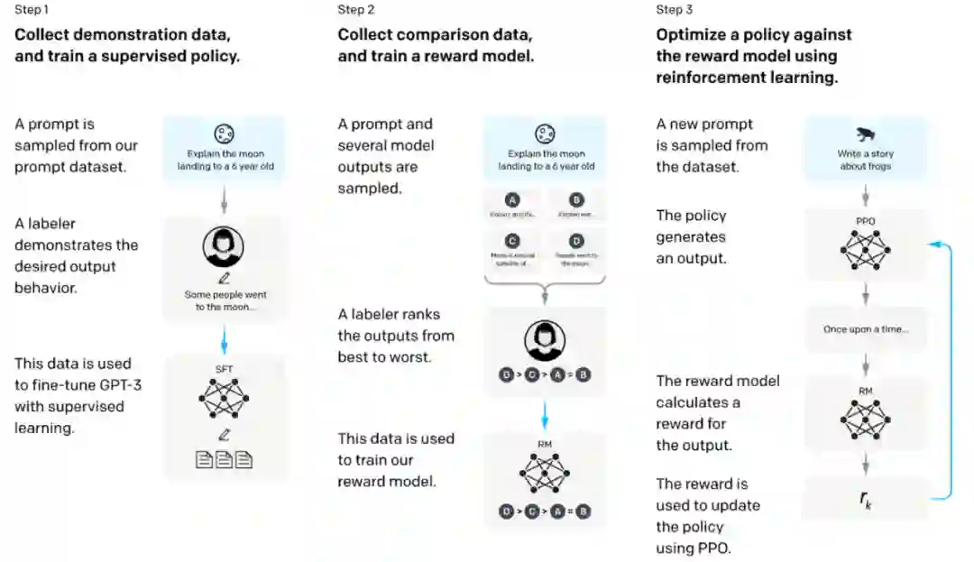 可见,NLP 学界的关注点,逐渐从 “怎么打造模型”,过渡到了 “怎么打造框架”,也就是将更多的实体纳入到语言模型训练、推理的过程当中。最为典型的例子就是大家所熟知的 Reinforcement Learning from Human Feedback (RLHF), 基本原理就是让语言模型从与人的交互(反馈)中进行学习 [7],这一思想成为了 ChatGPT 画龙点睛的一笔。