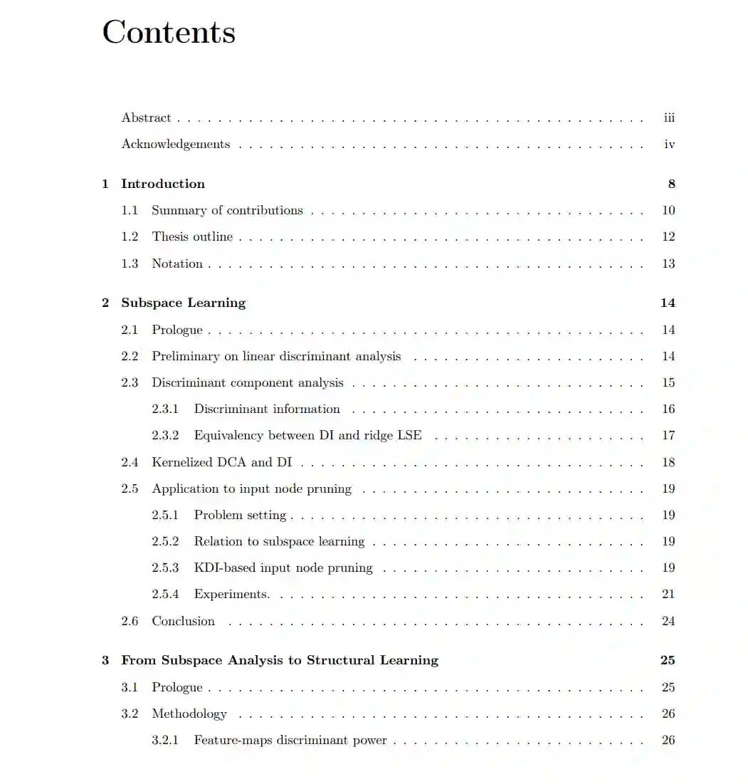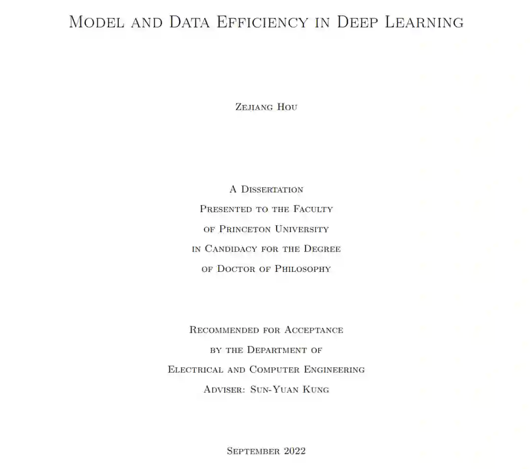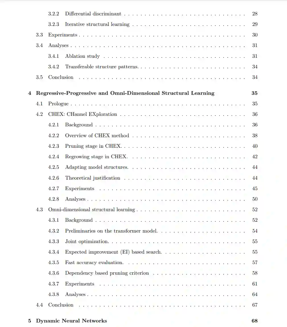 **随着大型模型的发展以及数据的爆炸性增长和可用性,深度学习在众多现实应用中取得了巨大而广泛的突破。**然而,深度学习模型通常具有过高的计算和内存成本,不适合在移动设备或边缘设备上进行实际部署。此外,深度学习模型面临着学习和快速适应的挑战,从只有几个例子来解决新的任务。因此,本文提出了学习计算效率高的模型架构的技术和提高少样本学习能力的方法。**我们从子空间分析方法及其在特征选择问题中的应用开始。然后将这些方法扩展到深度神经网络结构学习(deep neural network structural learning, SL)中,目的是减少冗余参数,以获得能够保持甚至提高精度的最优降维模型。**还介绍了基于混合剪枝-再生长技术的更高效的SL方法和可以跨更多维度降低模型的更通用的SL方法。除了静态模型设计之外,本文还提出了动态神经网络方法,可以在推理过程中根据不同的输入动态调整模型权重和结构,以控制计算效率并提高表示能力。除了模型效率外,还提出了训练模型的技术,可以从几个例子中快速泛化。本文提出一种少样本架构自适应方法,通过元学习一个任务感知架构控制器,为不同的少样本任务定制特定于任务的模型结构。与传统的NAS方法需要对每个新任务进行单独的搜索成本不同,所提出方法在一次性元训练成本后,在几分钟内从GPU数据集中直接生成特定于任务的模型结构。最后,提出了一种基于语言辅助表示的掩码图像预训练的跨模态自监督学习框架。由此产生的模型产生了高质量的可迁移表示,提高了许多计算机视觉任务的准确性,并对对抗性/分布外样本表现出强大的鲁棒性。所产生的模型适用于结构学习以获得更大的计算效率,也适用于低资源任务适应以获得更好的数据效率。