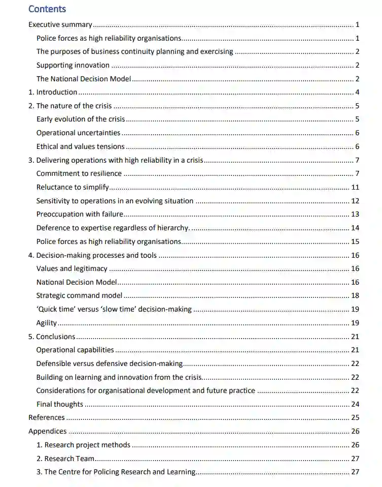 这个项目研究了在国家(和国际)危机所产生的不确定性和意外事件的背景下,高级警察决策。本报告借鉴了对两个英国警察部队的16名高级官员和工作人员的详细访谈:一个大都市的警察部队和一个有大量农村和沿海警务元素的较小部队。主要的数据收集是在2020年10月至2021年3月期间进行的。报告还借鉴了公开的文件,以及2021年4月与警务研究和学习中心的警务成员就新发现进行的研讨会讨论。