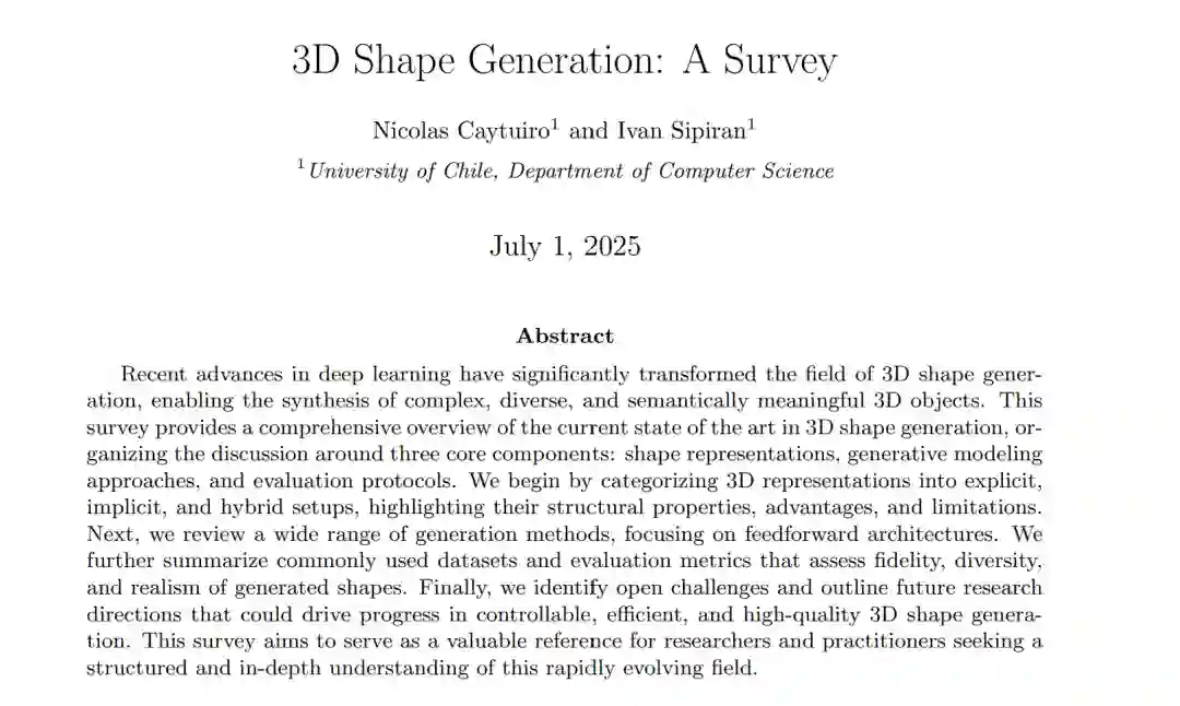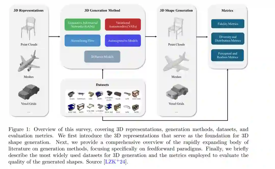 由于在多个领域中具有广泛的应用价值,3D形状的生成建模近年来受到了极大的关注,涵盖医学【GYS+18, FWB+23, DWB+25】、机器人学【NZZC20】、生物信息学【HSVW22, XYS+21, YZP+23】、计算机辅助设计【HPG+22, LLW22, HHL+24b】、文化遗产保护【HS18, XSG+24】等多个方向。为了支持这些下游任务,一个成功的3D生成模型应同时具备保真性与概率性【ZDW21】:保真的模型能够生成几何上合理且视觉上真实的形状,同时在有条件生成时遵循部分观测(如深度图或遮挡);而概率性的模型则需要捕捉3D形状生成中固有的不确定性与多模态性,能够在不完整或模糊的输入下生成多样化的结果。 考虑到深度学习对数据的高度依赖,构建与评测大规模3D形状数据集已成为训练和评估生成模型的重要基础【CFG+15, ZSK+15】。 本文综述了基于深度学习的3D形状生成技术(参见表1)。相较于传统的3D获取与建模方法——依赖手工特征与算法管线以追求几何精度——基于深度学习的3D形状生成具备自动学习复杂、高维潜空间的能力,能够同时捕捉3D物体的结构属性与语义特征。这不仅支持新颖多样的形状合成,还允许在潜空间中进行直观的操作,如插值、外推及条件编辑。 然而,学习生成3D形状面临诸多独特挑战。3D形状本身的复杂性与不规则性,以及实际应用中多样的需求,导致当前仍缺乏统一的3D表示形式【XLZ+20】。相反,不同任务常采用不同的3D表示方式,每种表示均具有自身的结构特性、优势与局限,这些因素会直接影响模型设计、数据处理及评估策略。 我们将本文的讨论围绕3D形状生成流程中的三个核心组成部分展开:形状表示、生成方法与评估协议。图1展示了本综述的整体框架。第二节介绍了研究范围与相关工作;第三节介绍主要的3D形状表示类别:显式表示、隐式表示与混合表示;第四节深入探讨与3D形状生成最相关的方法,重点聚焦前馈式生成模型;第五与第六节分别介绍评估生成形状保真度与多样性所常用的数据集与指标;最后,第七节讨论当前仍存在的开放挑战与未来研究方向。