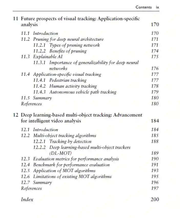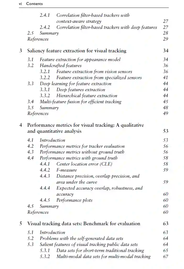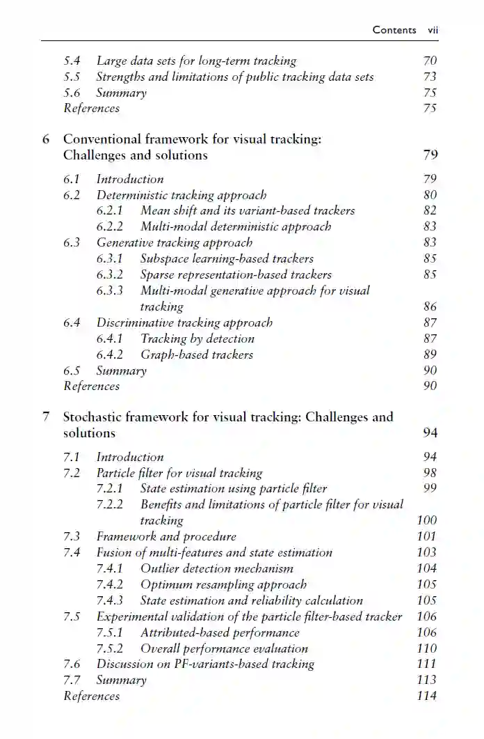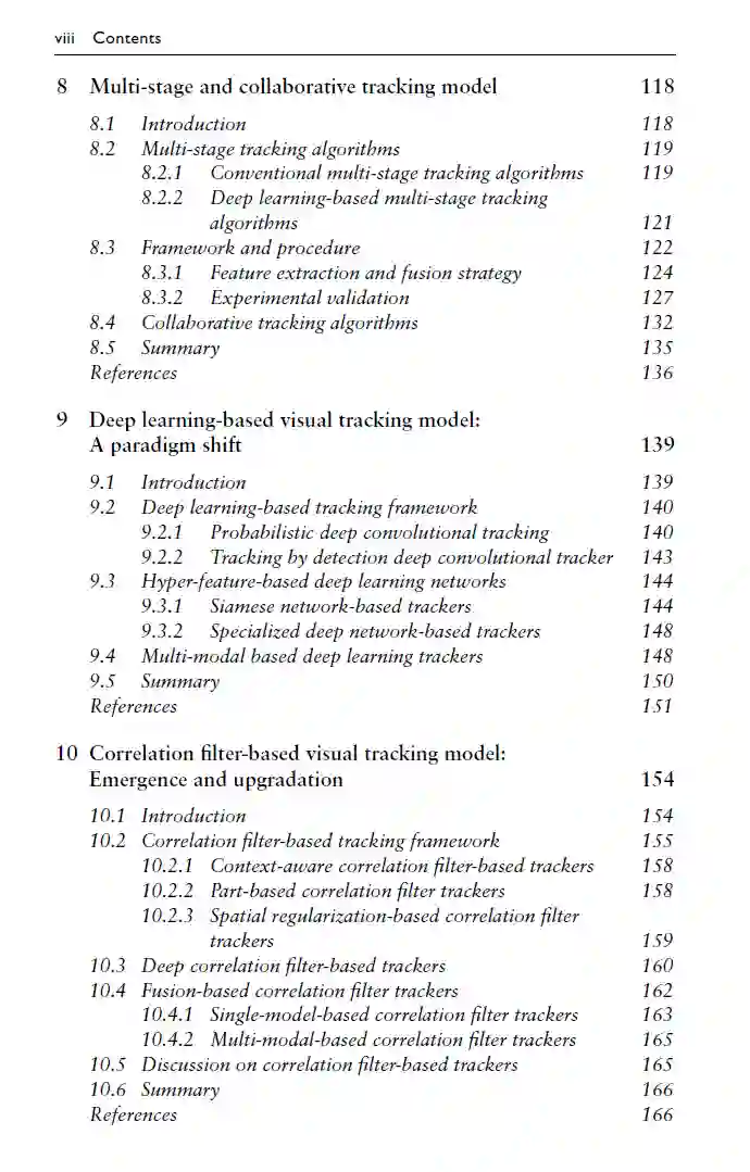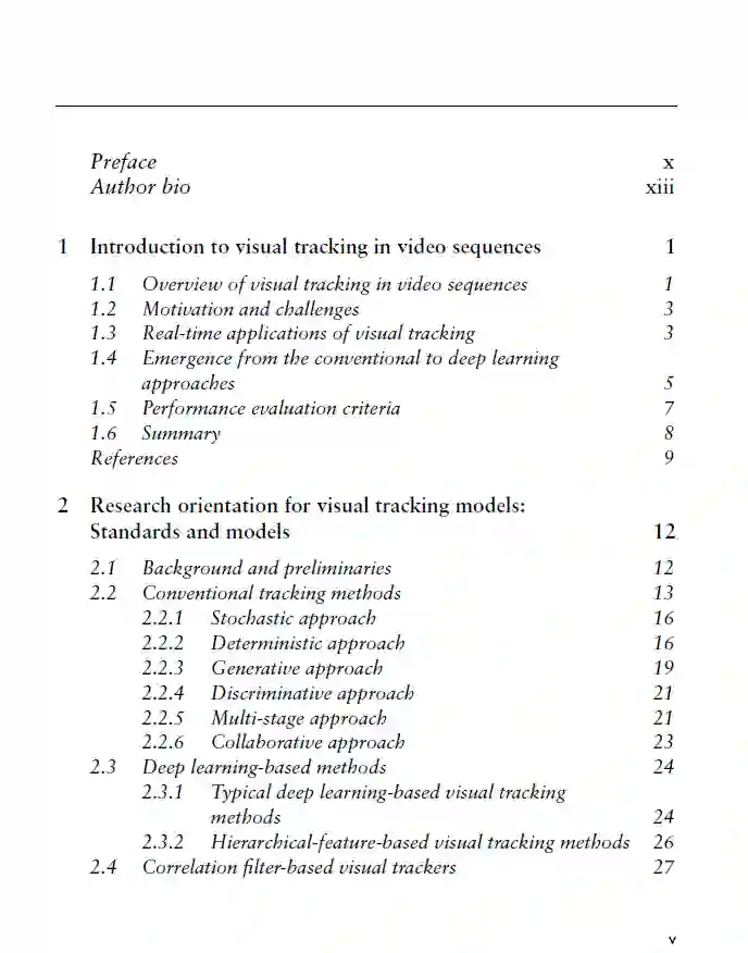这本书涵盖了传统方法和先进方法的描述。在传统方法中,我们讨论了诸如随机、确定性、生成性和区分性的视觉跟踪技术。传统技术进一步被探索为多阶段和协作框架。在先进的方法中,分析了基于深度学习的跟踪器和基于相关滤波器的跟踪器的各种类别。