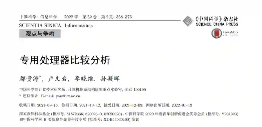 针对专用处理器有很多关键问题, 包括: 芯片在架构上有什么差异, 各自具备什么样的软件生态, 能否取得商业上的成功的决定性因素是什么等, 而答案也莫衷一是. 本文的重点是试图从架构层面去 看待这些不同类别的专用处理器芯片的差异, 帮助我们预测未来架构的发展趋势, 对于专用处理器技 术未来的发展做了些许开放性的讨论, 抛砖引玉. 其次, 本文主要讨论经典专用处理器的演化, 而把通 用 CPU 的发展作为背景而暂不加以专门讨论. 同时, 本文主要以 DSP、GPU、AI 芯片和 NPU (网络 处理器) 为主要参考对象, 其中 DSP 以 TI 公司的 C6000 系列为主要参考, GPU 以英伟达 (Nvidia) 公司的 Tesla 架构为主要参考 [4] , AI 芯片以寒武纪的 DianNao [5] 深度学习处理器和 Google 公司的 TPU (tensor processing unit) [6] 为主要参考, NPU 以迈络思 (Mellanox) 公司 (已经被 Nvidia 公司收 购) 的 NP-5 和因特尔 (Intel) 的 IXP [3] 为主要参考, 均为各个公司比较有代表性的产品. 限于篇幅, 本文尚未将新出现 DPU (data processing unit) [7] 芯片架构纳入讨论, 相关内容将作为未来工作.