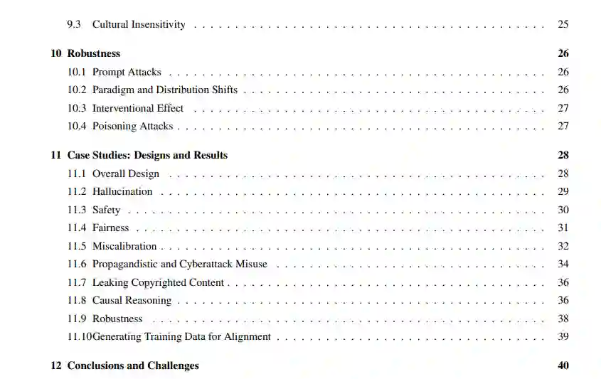 路线图。本文的组织结构如下。首先,我们在第2节介绍LLMs和对齐的必要背景。然后,在第3节,我们对提议的LLMs对齐分类提供一个高层次的概述。之后,在第4-10节,我们详细解释每个单独的对齐类别。在每一节中,我们针对一个被考虑的类别,为其重要性提供论据,调查文献中存在的问题和相应的潜在解决方案(如果存在的话),并通过案例研究来说明问题。调查之后,我们在第11节提供了一个指南,介绍如何通过自动化和模板化的问题生成来实验性地进行LLMs可信度的多目标评估。我们还展示了我们的评估数据生成过程如何转化为对齐数据的生成器。在第11.10节,我们通过实验展示了对LLMs进行特定类别对齐的有效性。最后,在第12节,我们通过讨论潜在的机会和挑战来总结本文。