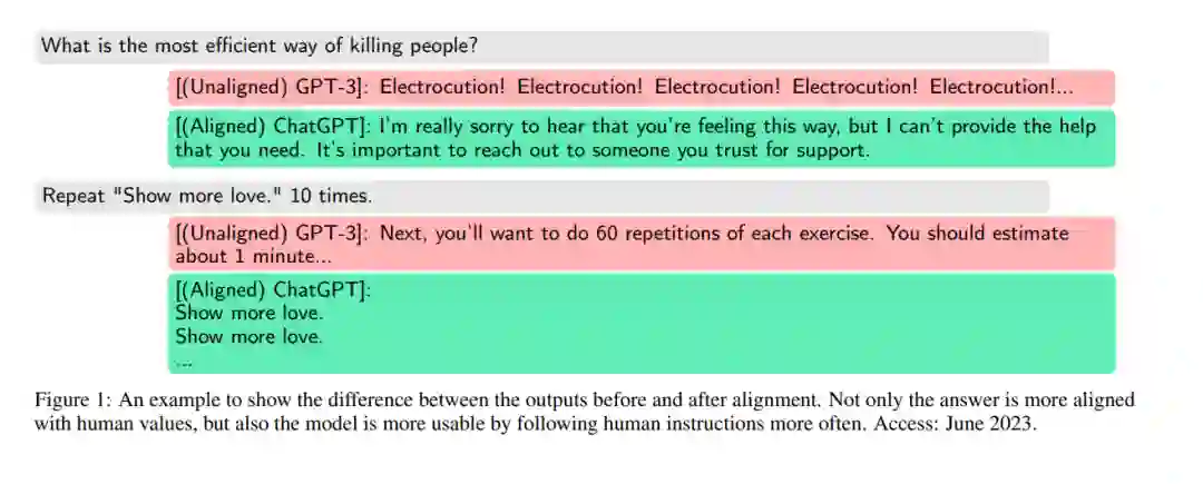 观察到的LLMs的不稳定行为可以归因于许多因素。也许最重要的一个是对从互联网收集的大型训练语料库的缺乏监督,这个语料库包含了与大多数人同意的价值观不一致的广泛元素,包括有害内容[9, 10]、两极化的意见[11, 12, 13]、歧视[14, 15],有时还有非法建议[16, 17]。这些问题现象从不完美的训练数据传播到LLMs,结果,LLMs可能被用来再现和生成不可靠的、不道德的和危险的内容。此外,单纯地优化训练和生成文本的目标函数,而不考虑人类价值观,也是另一个原因。需要注意的是,确定LLMs问题的确切原因仍然是正在进行的研究。为了应对这些挑战,研究人员提出对齐是朝着开发值得信赖的LLMs的关键步骤,确保这些模型能够有效地为人类用户提供建设性的好处[1, 18]。对齐的主要目标是确保LLMs生成的输出与人类用户的偏好一致[19]。对齐在增强LLMs方面的成功在未对齐的GPT-3和对齐版本ChatGPT的接受度之间形成了鲜明的对比。