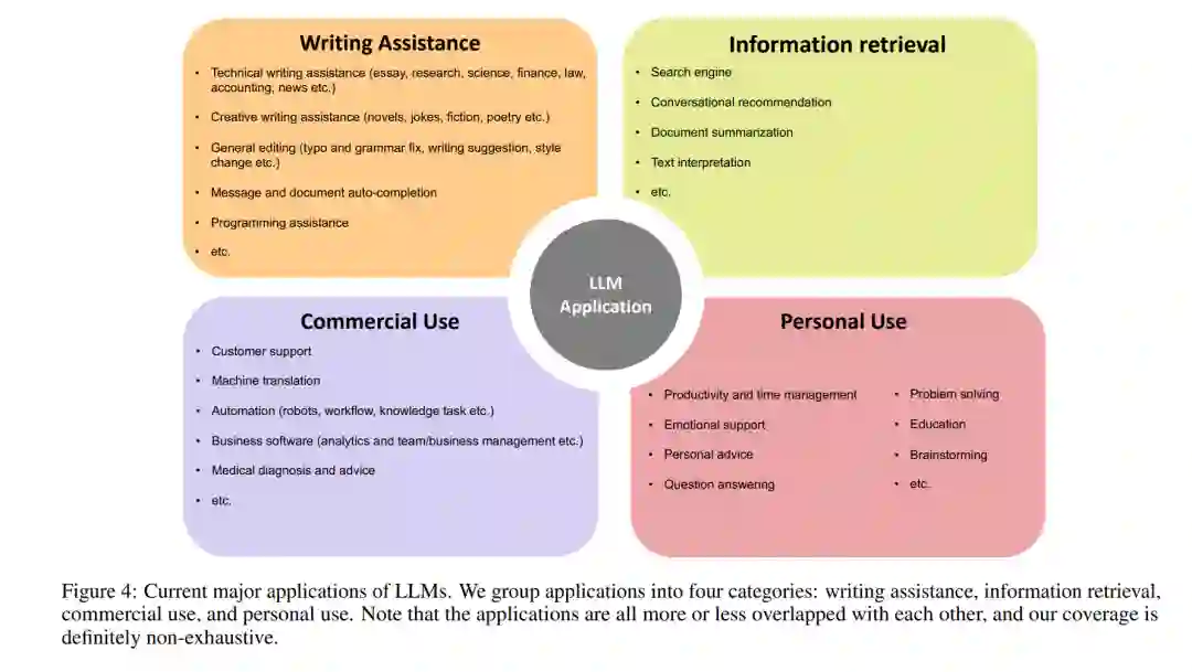 为了说明我们如何确定建议的分类法,我们首先简要概述了图4中LLM的当前主要应用,这在很大程度上影响了我们选择分类法的方式。不用说,考虑到从业者持续地以惊人的速度和创新热情构建利用LLM的商业和非商业想法,图4中涵盖的应用是不尽的。