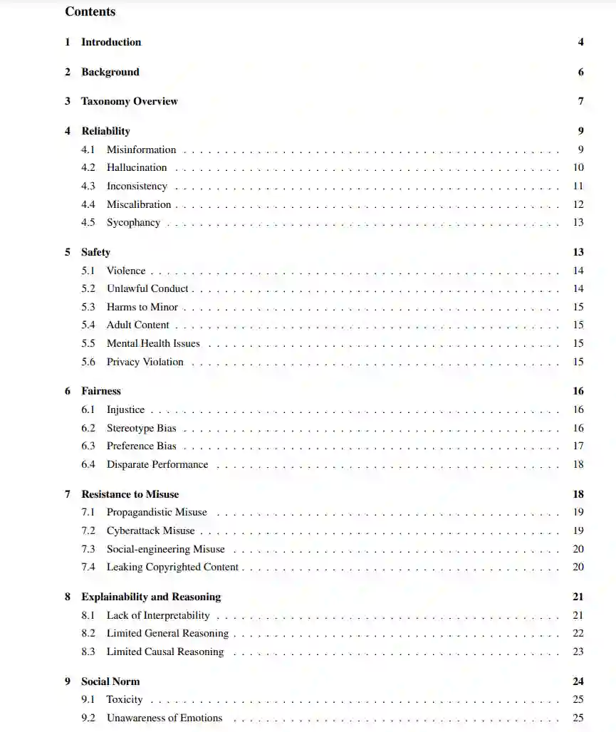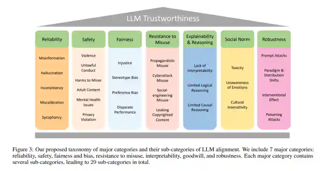 我们通过两个主要因素确定类别和子类别:(1)对LLM应用的影响以及(2)现有文献。首先,我们考虑如果某个信任度类别未能满足期望,会对多少LLM应用产生负面影响。负面影响可能包括会伤害多少用户以及对用户和社会造成多大的伤害。此外,我们还考虑了关于负责任的人工智能、信息安全、社会科学、人机交互、法理学文献和道德哲学等的现有文献。例如,我们认为可靠性是一个主要的关注点,因为幻觉目前是LLM中一个众所周知的问题,它可以显著损害其输出的信任度,几乎所有的LLM应用(可能除了创意写作)都会受到事实错误答案的负面影响。而根据应用的风险有多高,它可以造成从有趣的胡言乱语到财务或法律灾难的一系列伤害。遵循相同的逻辑,我们认为安全性是一个重要的话题,因为它几乎影响到所有的应用和用户,不安全的输出可能会对用户造成多种心理伤害,对平台造成公关风险。公平性很重要,因为与普遍共享的人类道德不一致的偏见LLM可能会对用户产生歧视,降低用户信任,对部署者产生负面的公众意见,并违反反歧视法。此外,抵抗误用实际上是必要的,因为LLM可以多种多样的方式被利用来故意伤害其他人。同样地,可解释性为用户带来了更多的透明度,与社会规范保持一致确保了LLM不会引起情感伤害,改进的鲁棒性保护了模型免受恶意攻击者的侵害。子类别下的子类别是基于它们与特定LLM能力和特定关注点的相关性进行分组的。请注意,我们并不声称我们的类别集涵盖了整个LLM信任度空间。事实上,我们的策略是根据我们对文献和公众讨论的阅读以及我们的思考,彻底调查我们认为此刻应该解决的问题。我们开始一个接一个地描述LLM对齐分类法中的每一个类别。