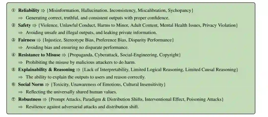 然而,尽管对齐是LLMs受欢迎的核心技术,但评估这些模型中对齐的程度以及设计适当的对齐任务仍然是尚未解决的挑战,目前没有明确和有原则的指导可供参考。特别地,缺乏既定和统一的讨论,涵盖使LLMs值得信赖的全方位对齐。现有的文献提出了多种对齐任务的考虑因素,其中一个值得注意的一般指导原则是“HHH" 原则[20],主张对齐应该是有帮助的、诚实的和无害的。此外,[21]中提出了一个与构建LLMs相关的风险分类,包括六个风险:(1) 歧视、排斥和有毒性,(2) 信息危害,(3) 虚假信息危害,(4) 恶意使用,(5) 人机交互危害,以及(6) 自动化、访问和环境危害。虽然这个分类提供了相关问题的全面覆盖,但它可以进一步解开每一个维度。