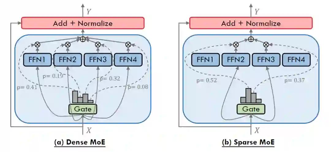 图2:密集激活的MoE层和稀疏激活的MoE层图示[8] 根据门控网络的激活方式,MoE可以大致分为两类,如图2所示: