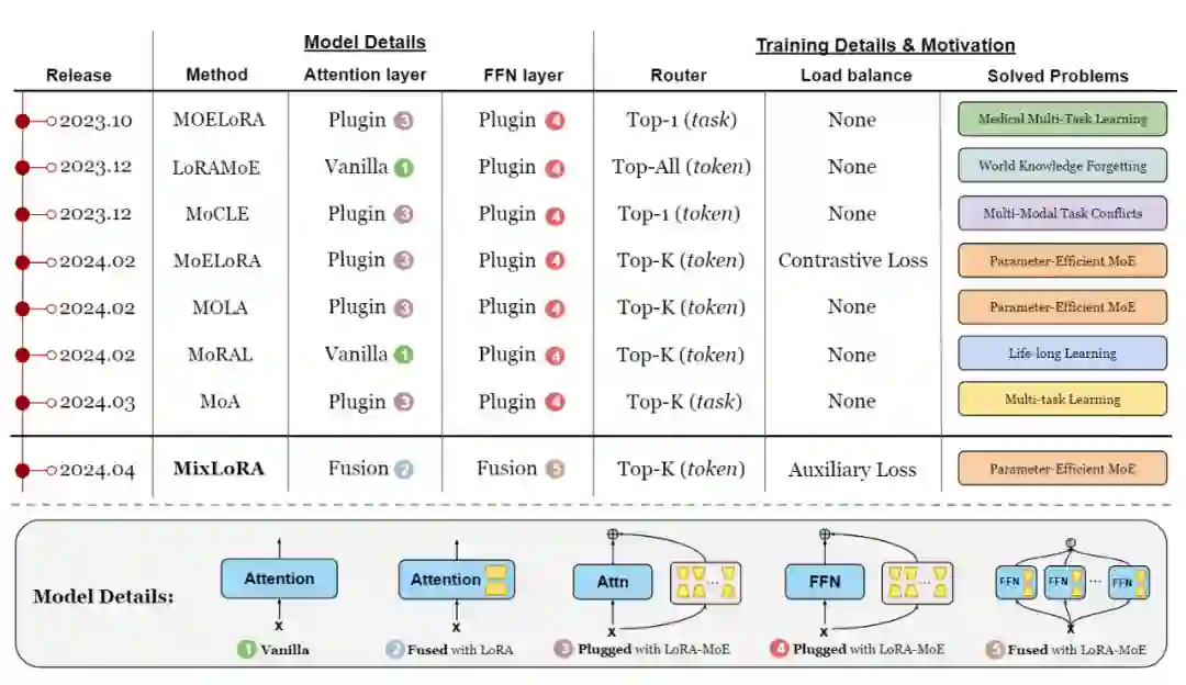 图5:LoRA-MoE相关工作的发布时间、实现细节及目标问题[35]
