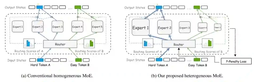 在传统的MoE模型中,所有专家都采用相同的结构和大小,降低了专家间的区分度与专家的专业化潜力。腾讯混元团队在2024年提出的混合异构专家模型[21]填补了异构专家设计的空白。如图4所示,该研究通过为专家分配差异化的隐藏层维度,构建了能自适应处理不同复杂度语言单元的专家系统,其中小规模专家专注常规特征处理,大规模专家应对复杂语义推理。为优化专家激活策略,他们还提出参数惩罚损失函数(P-Penalty),通过引入专家容量权重因子,有效抑制了训练过程中大专家过度激活的现象,促使模型在保证性能的前提下优先调用轻量级专家。