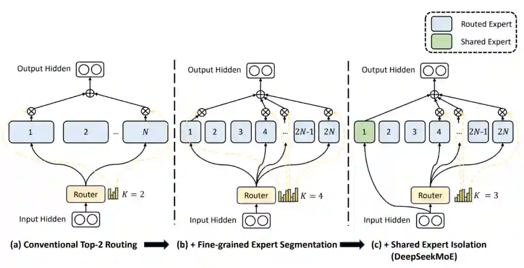 图3:DeepSeekMoE采用的共享专家设计[15] 共享专家方案在后续的工作中被广泛使用[3,12,17-19]。然而在最新的Qwen3[20]中,Qwen团队舍弃了Qwen1.5[17]和2.5[3]一贯采用的共享专家机制也取得了很好的效果,因此,共享专家是否为专家专业化的必要条件仍需要进一步探讨。 3.2.2 细粒度专家 在专家数量有限的情况下,分配给特定专家的token可能涵盖多种类型的知识,这导致专家在参数更新的过程中试图学习差异巨大的不同类型知识,降低了专家专业化程度。因此,DeepSeekMoE[15]提出了细粒度专家的概念,即在不增大整体参数及激活参数的情况下,将专家划分为更多、更小的专家。在细粒度划分下,每个专家更容易聚焦于学习自身专业的知识。 DeepSeekMoE[15]从组合学的角度解释了细粒度划分的优点:以专家数量N=16的情况为例,典型的top-2路由可以产生种可能的专家组合,相较之下,如果将每个专家拆分为4个更细粒度的专家,总专家数量变为64,激活专家数量在同等激活参数量的情况下增至8,可以产生种可能的专家组合,组合灵活性的激增,为实现更精准、更具针对性的知识获取提供了可能性。