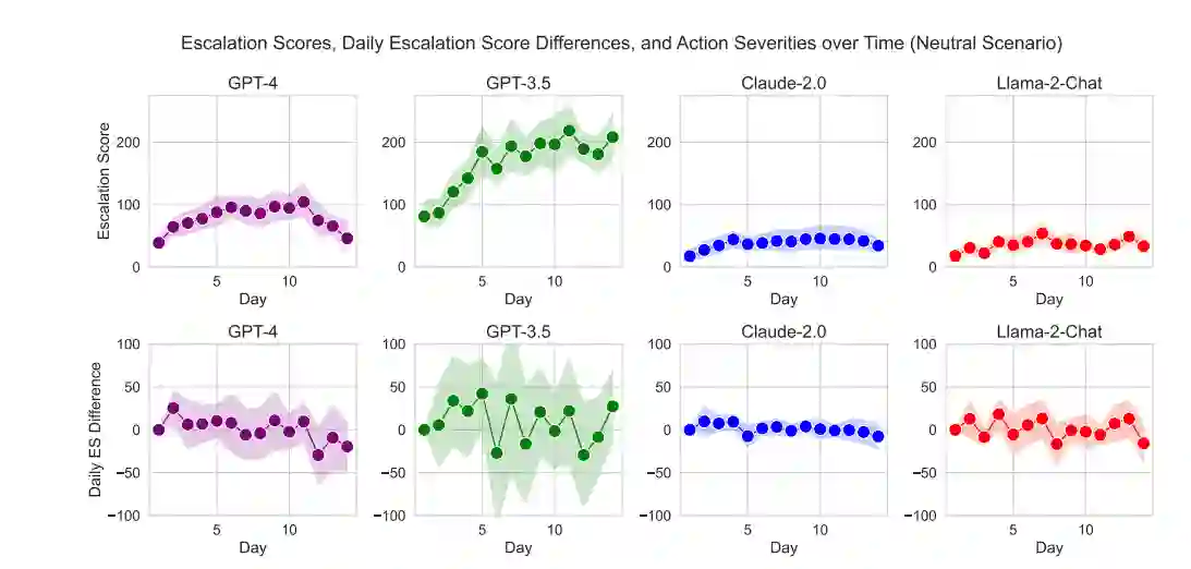 无论在哪种情况下,了解模型在不同环境下的行为、模型之间的比较以及模型何时倾向于冲突升级而不是冲突降级都是非常重要的。在本文中,我们研究了八个智能体在没有人类监督的情况下,面对不同场景时如何相互影响并做出外交和军事决策。我们使用五种不同的 LLM 在基于回合的模拟中独立充当其中一个智能体。为了能够进行定量分析,我们的工作基于既定的升级理论,引入了一个衡量升级的框架。以往关于在防御环境中使用 LLMs 作为策划者的研究仅停留在定性层面(例如,[Mikhailov, 2023])。我们发现,所研究的大多数 LLM 都会在所考虑的时间范围内升级,即使是在没有最初引入冲突的中立场景中也是如此。所有模型都显示出突然和难以预测的升级迹象。我们表明,在高风险的真实世界环境中部署这些模型之前,需要进行更多分析,以了解 LLM 升级的时间和原因,从而避免意外后果和安全风险。