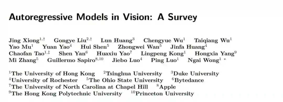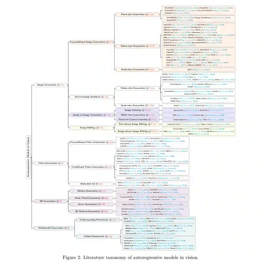 自回归模型在自然语言处理(NLP)领域取得了巨大成功。最近,自回归模型逐渐成为计算机视觉领域的重要研究方向,并在生成高质量视觉内容方面表现出色。NLP中的自回归模型通常在子词级别上进行操作,然而,在计算机视觉中,数据的表示策略可以在像素级、令牌级或尺度级进行,以反映视觉数据的多样性和层次性,这与语言的顺序结构有所不同。本综述全面梳理了视觉自回归模型的相关文献。为了提升不同学科背景的研究者的可读性,我们首先介绍视觉中的序列表示和建模基础。接着,我们将视觉自回归模型的基本框架划分为三类:基于像素、基于令牌和基于尺度的模型,这些分类基于不同的表示策略。然后,我们探讨自回归模型与其他生成模型之间的内在联系。此外,我们对计算机视觉中的自回归模型进行了多维度分类,包括图像生成、视频生成、3D生成和多模态生成,并详细介绍了其在各类领域的应用,包括新兴领域如具身人工智能(Embodied AI)和3D医学人工智能,参考文献多达250篇。最后,我们指出了当前视觉自回归模型所面临的挑战,并提出了未来潜在的研究方向。我们还在Github上建立了一个仓库,收录了本综述涉及的相关文献,网址为:https://github.com/ChaofanTao/Autoregressive-Models-in-Vision-Survey https://arxiv.org/pdf/2411.05902