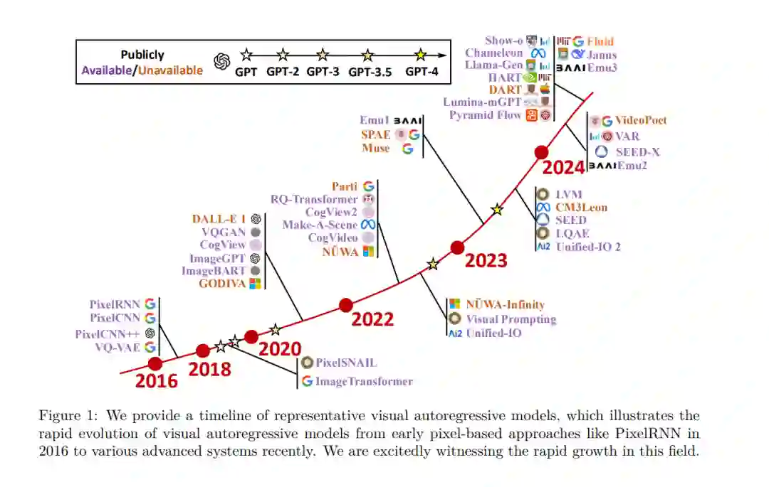 自回归模型通过基于先前元素的条件概率预测序列中的每个元素来生成数据,最初在自然语言处理(NLP)领域获得了突出地位(Vaswani 等人,2017;Radford 等人,2019;Brown 等人,2020;Achiam 等人,2023;Wan 等人,2023;Zhou 等人,2023a)。这种成功可归因于其捕捉长距离依赖和生成高质量、上下文相关输出的内在优势。特别是,经验性缩放定律(Henighan 等人,2020;Hoffmann 等人,2022;Muennighoff 等人,2023;Tao 等人,2024;Lyu 等人,2023)表明,增加模型规模和计算预算会持续改善跨熵损失,在图像生成、视频建模、多模态任务和数学问题求解等各个领域都遵循通用的幂律关系。受其在 NLP 中的成就启发,自回归模型最近开始在计算机视觉领域展示出巨大的潜力。图 1 的时间线展示了视觉自回归模型演变的关键里程碑和发展,强调了它们从 NLP 到计算机视觉的过渡。迄今为止,自回归模型已被应用于广泛的生成任务,包括图像生成(Parmar 等人,2018;Chen 等人,2020)、图像超分辨率(Guo 等人,2022;Li 等人,2016)、图像编辑(Yao 等人,2022;Crowson 等人,2022)、图像到图像翻译(Li 等人,2024e;Li 等人,2024d)和视频生成(Tulyakov 等人,2018;Hong 等人,2022)、多模态任务(Yu 等人,2023c;Lu 等人,2022)以及医疗任务(Ren 等人,2024;Tudosiu 等人,2024)等。这种广泛的适用性强调了进一步探索和应用自回归模型的潜力。随着视觉自回归模型的迅速发展,跟上最新的进展变得越来越具有挑战性。因此,对现有工作的全面综述对于研究社区来说是及时且重要的。本文旨在对视觉自回归的最新发展进行深入概述,并探索未来改进的潜在方向。我们强调,至少有三种由序列表示策略定义的不同类别的视觉自回归模型:基于像素的、基于令牌的和基于尺度的模型。Pixel-RNN(Van Den Oord 等人,2016)作为像素级模型的代表,通过将二维图像转换为一维像素序列来预测下一个像素,捕捉了局部和长距离依赖,但计算成本较高。受 NLP 启发的下一个令牌预测将图像压缩为离散令牌,以高效处理高分辨率图像,代表性模型如 VQ-VAE(Van Den Oord 等人,2017)。VAR(Tian 等人,2024)引入了下一个尺度预测,这是一种分层方法,从粗到细自回归地生成多个尺度的内容,捕捉多分辨率的视觉信息。每个类别都提供了独特的优势和挑战,使其成为未来研究的有前途的方向。我们进一步从多角度介绍了自回归模型在计算机视觉中的分类,基于序列表示策略、底层框架或目标任务对现有模型进行分类。我们的分类旨在提供一个结构化的概览,展示这些模型如何在各种视觉任务中被利用。然后,我们提出了定量和定性的指标来评估其性能和适用性。最后,我们强调了自回归模型当前的局限性,如计算复杂度和模式崩溃,并提出了未来研究的潜在方向。总之,本综述做出了以下贡献:
