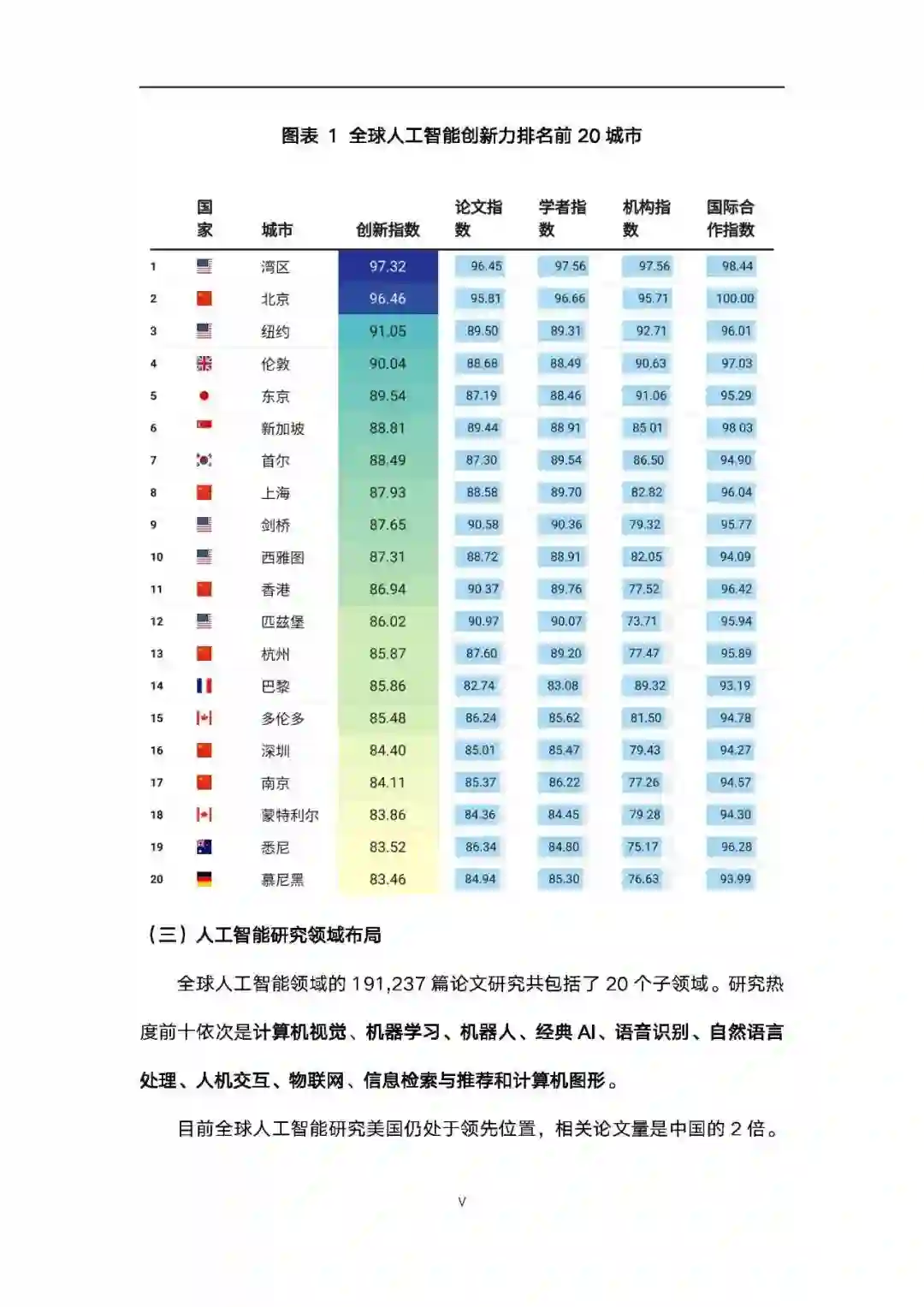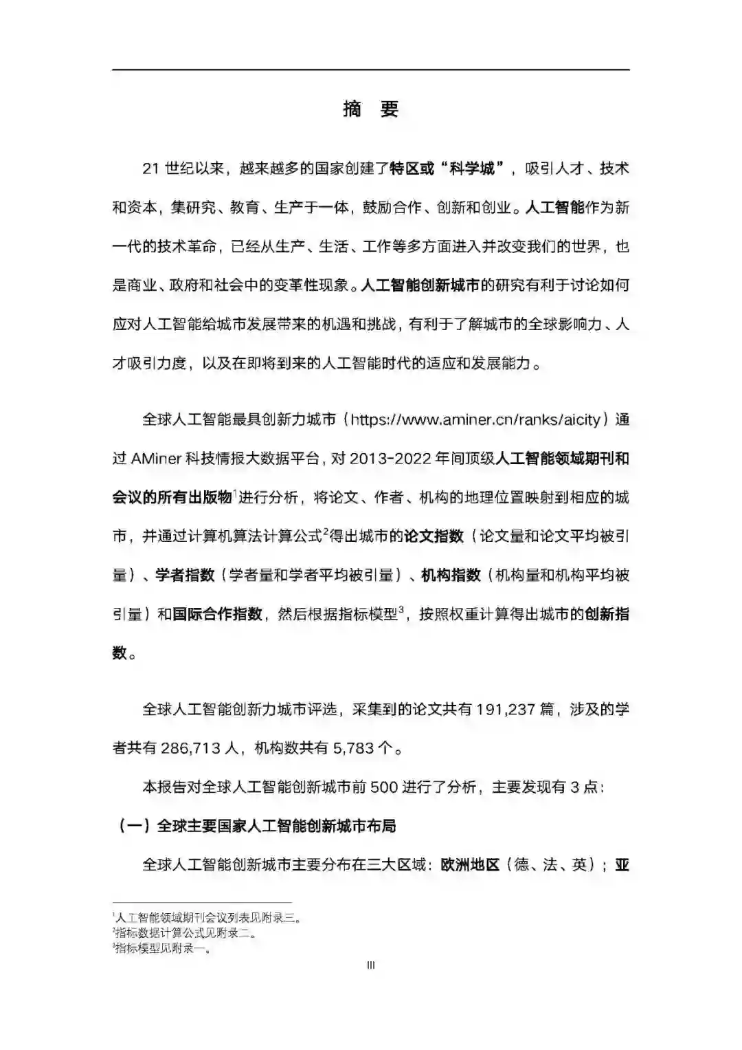 21 世纪以来,越来越多的国家创建了特区或“科学城”,吸引人才、技术和资本,集研究、教育、生产于一体,鼓励合作、创新和创业。人工智能作为新一代的技术革命,已经从生产、生活、工作等多方面进入并改变我们的世界,也是商业、政府和社会中的变革性现象。人工智能创新城市的研究有利于讨论如何应对人工智能给城市发展带来的机遇和挑战,有利于了解城市的全球影响力、人才吸引力度,以及在即将到来的人工智能时代的适应和发展能力。全球人工智能最具创新力城市通过 AMiner 科技情报大数据平台,对 2013-2022 年间顶级人工智能领域期刊和会议的所有出版物进行分析,将论文、作者、机构的地理位置映射到相应的城市,并通过计算机算法计算公式得出城市的论文指数(论文量和论文平均被引量)、学者指数(学者量和学者平均被引量)、机构指数(机构量和机构平均被引量)和国际合作指数,然后根据指标模型3,按照权重计算得出城市的创新指数。全球人工智能创新力城市评选,采集到的论文共有 191,237 篇,涉及的学 者共有 286,713 人,机构数共有 5,783 个。