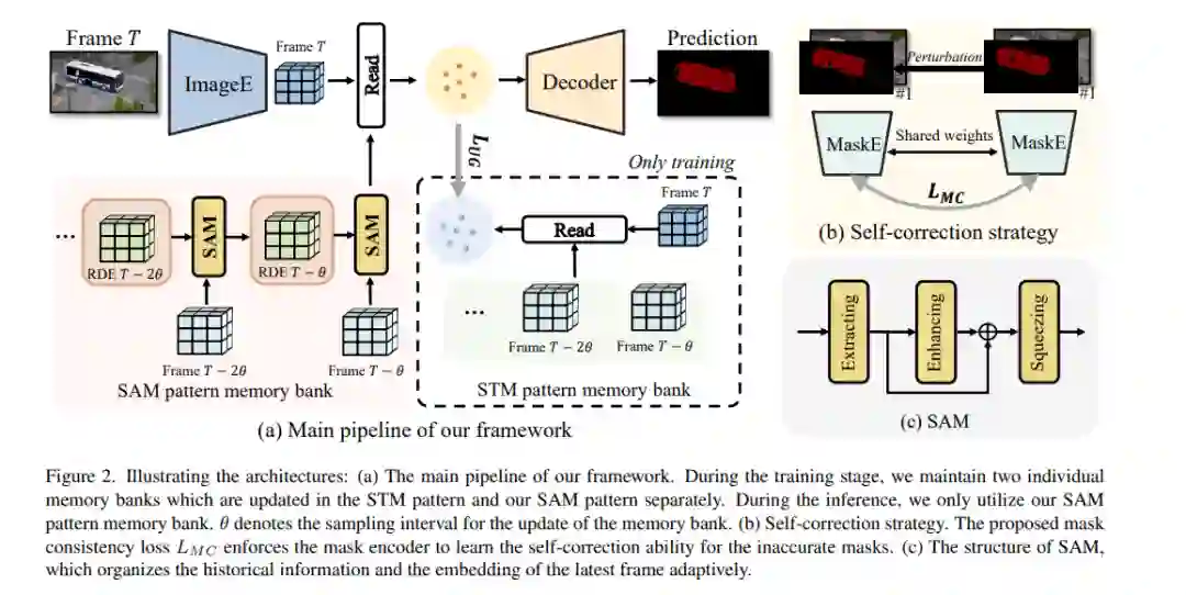 基于时空记忆(STM)的视频目标分割(VOS)网络通常每隔几帧不断增加存储库,表现出良好的性能。然而,1)随着视频长度的增加,硬件无法承受不断增长的内存需求。2)存储大量的信息不可避免地会引入大量的噪声,这不利于从存储库中读取最重要的信息。在本文中,我们提出一种循环动态嵌入(RDE)来建立一个固定大小的存储库。具体来说,我们通过提出的时空聚合模块(SAM)显式地生成和更新RDE,该模块利用历史信息的线索。为了避免重复使用SAM造成的误差积累,我们在训练阶段提出了无偏导损失,这使得SAM在长视频中更稳健。此外,由于不准确的网络推断,在内存库中预测的掩码是不准确的,影响了查询帧的分割。为了解决这一问题,我们设计了一种新的自校正策略,使网络能够修复存储库中不同质量的掩模嵌入。大量实验表明,我们的方法在性能和速度之间取得了最好的折衷。代码可在https://github.com/ Limingxing00/RDE-VOS-CVPR2022获得。