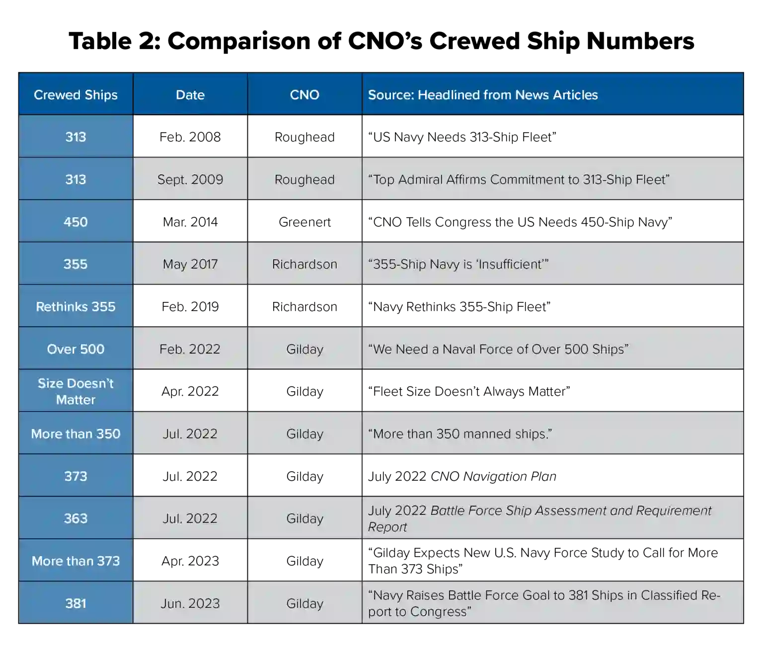 2017年12月,美国国会根据海军2016年兵力结构评估(FSA),规定海军必须拥有355艘兵力舰艇,2020年2月,众议员乔-考特尼(Joe Courtney)向时任国防部长马克-T. 埃斯佩尔抱怨说:"缺乏造舰计划,[唐纳德]特朗普政府没有提出建造 355 艘舰艇的海军战略"。2021 年 12 月,美国国会授权海军提交《兵力舰艇评估与需求报告》,介绍其近期、中期和远期的兵力结构计划,以满足作战指挥官在国防部批准的情况下提出的要求。然而,国会对海军 2023 财年(FY2023)的三十年造舰计划反应冷淡,尽管这是海军三年多来首次向国会提交此类报告。这导致国会授权在 2022 年 12 月成立一个独立的海军未来全国委员会,以确定到 2025 年中期海军舰队的规模和兵力组合。