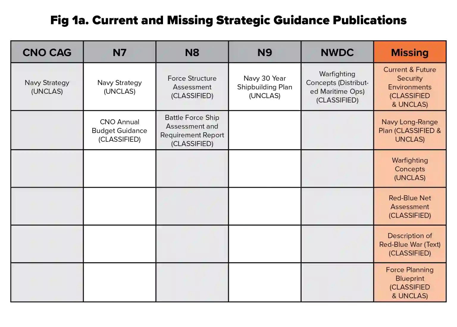 海军缺乏充分和连贯的指导,以确保战略影响其预算和作战概念。海军没有分类战略,无法明确表达其目的、方式和手段。它没有对当前和未来安全环境进行成文的评估,以提供对这些环境的基线认识,并为有效的概念驱动、以威胁为依据的能力发展创造条件。另一份缺失的文件是 2040 年代的作战概念。其结果是,在 2023 年,N9 的专业人员正在规划下一代平台,却没有一套共同的顶点战略指导。(见图 1a)。