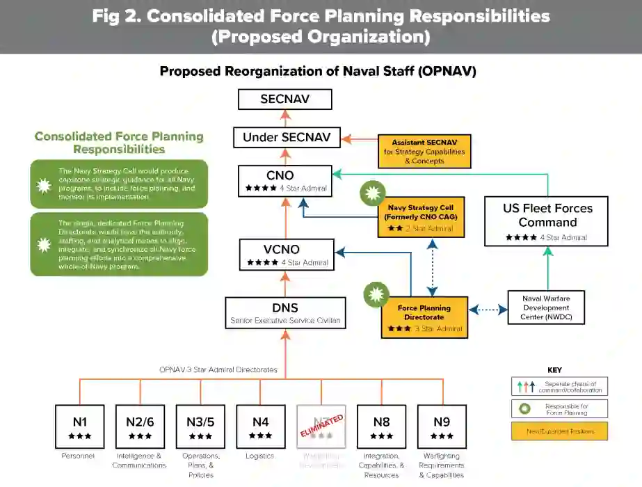 海军司令部应将 OPNAV 的所有兵力规划职责整合为一个新的兵力规划局,由一名海军中将领导,向海军司令部报告,并撤销 N7(见图 2)。