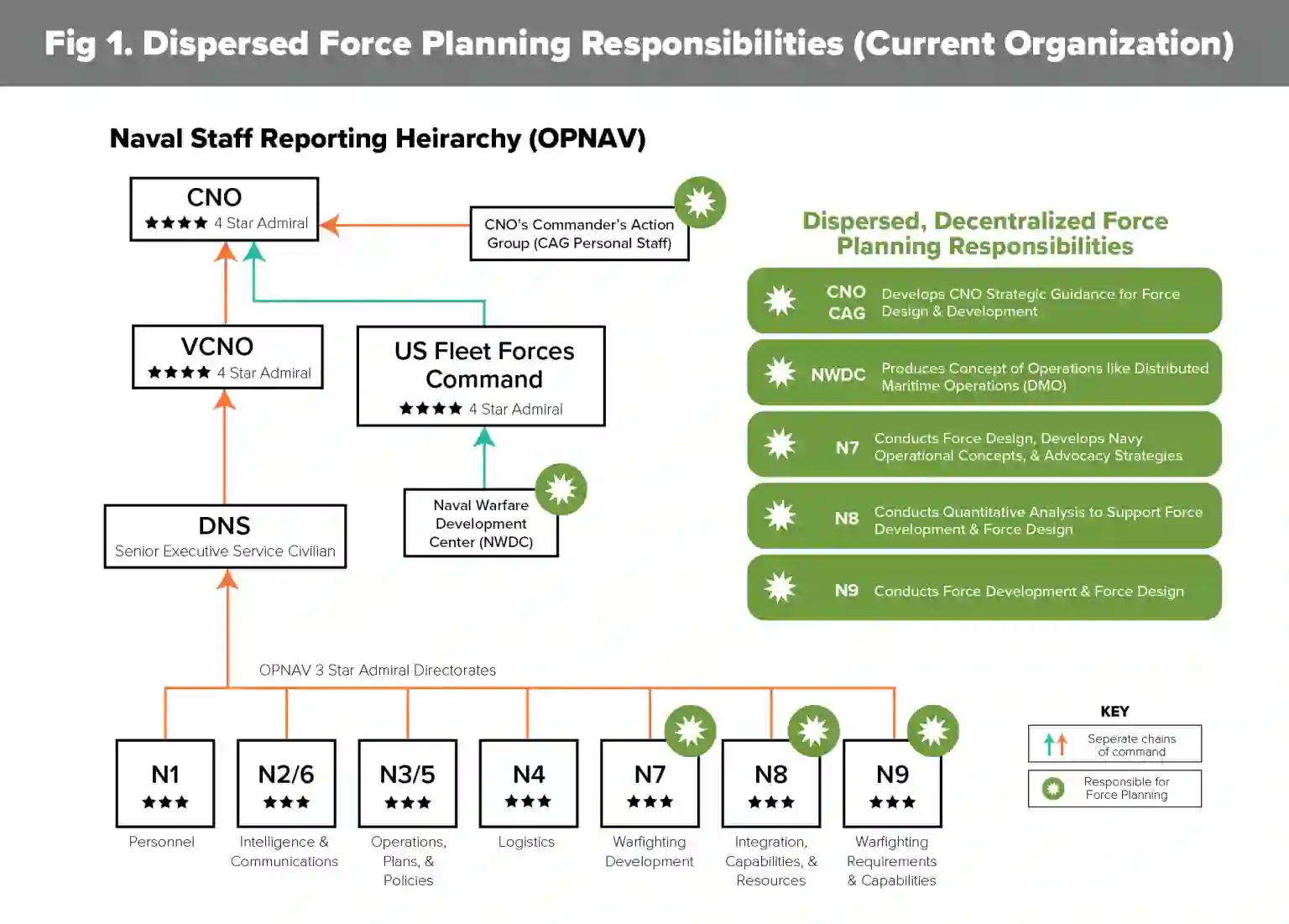 此外,这种兵力规划责任的分散也会带来有害后果。2022 年 2 月,海军作战司令部主办了一次名为 "兵力设计冲刺 "的研讨会,以评估海军的兵力设计态势。研讨会结束时,N7的一位高级领导告诉笔者,研讨会确定,"OPNAV的每个人都负责[兵力设计],但没有人负责"。对于一个军种来说,宣布 OPNAV 没有人真正负责兵力设计是一个惊人的发现,因为兵力设计的重点是未来的舰艇、飞机和武器系统,以及 20 多年时间跨度的作战概念。