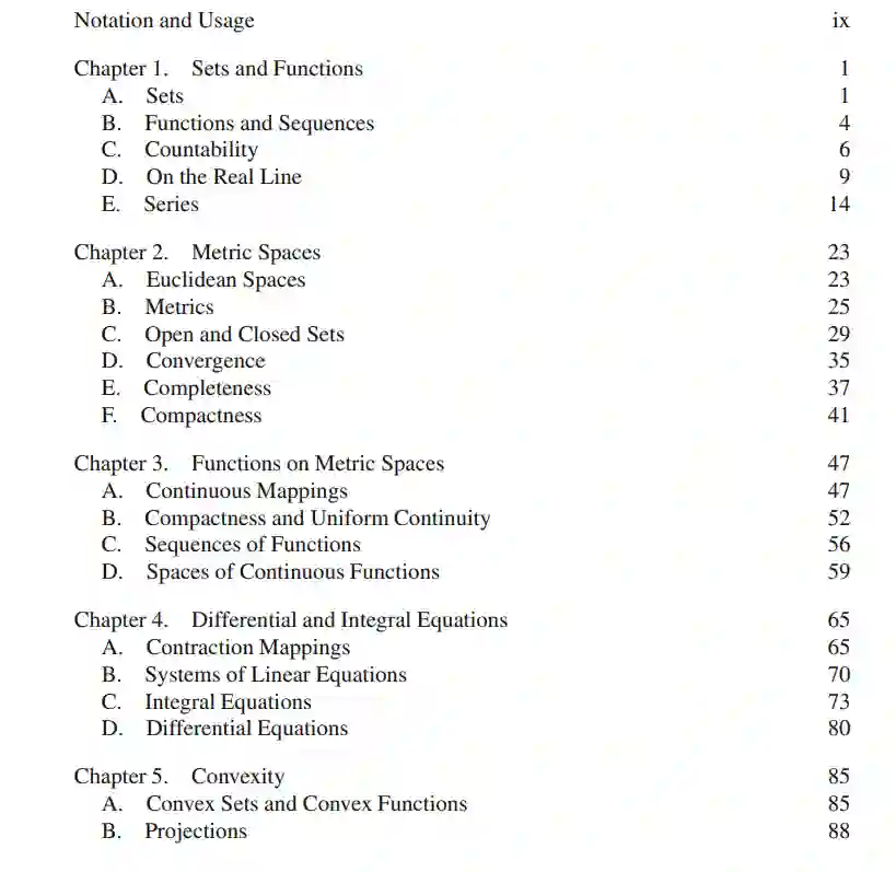 本书旨在作为科学家和工程师的第一门分析课程。它既可以用于高等本科水平,也可以作为研究生课程的一部分。几年来,我们一直根据这本书的初稿进行教学。本书围绕度量空间展开。在前三章中,我们将介绍基本内容。我们涵盖了所有重要的“4c”:收敛性、完备性、紧致性和连续性。我们把材料组织得尽可能简单和合乎逻辑。在后续章节中,我们将使用基本的分析工具对微分和积分方程、凸分析和测度理论等密切相关的主题进行简要介绍。这本书很短,但在一定程度上涵盖了最重要的主题。我们仔细考虑了哪些应该包括,哪些应该删除。考虑到所有这些因素,我们问自己,这种材料对科学家和工程师是否有直接和直接的用途。我们的哲学是“如果有疑问,不要犹豫。”