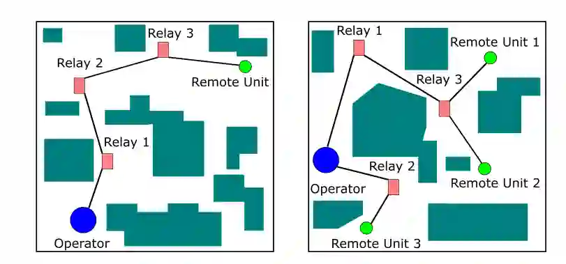 图 2.1:(a) 由三个机器人组成的链,它们将操作员的通信转发给远程单元;(b) 包含三个中继器的最小生成树,优化了操作员与三个单元之间的通信。