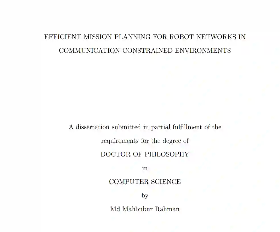 首先,重点开发了一种通信感知世界地图,它将传统的世界模型与多机器人位置规划相结合。我们提出的通信地图可选择一连串中间中继车辆的最佳位置,以便最大限度地提高与远程单元的通信质量。我们还提出了一种算法,当有多个远程单元需要服务时,可以建立一棵最小阿伯累树(min-Arborescence tree)。 其次,在通信被剥夺的环境中,我们利用视线(LoS)在移动机器人之间建立通信,控制它们的移动并向其他自主单元转发信息。我们提出并研究了多机器人中继网络定位问题的复杂性,并提出了近似算法,通过重新定位一个或多个机器人来恢复基于可见度的连接。