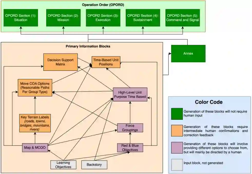 在模拟训练中达成专家级表现有赖于创建复杂、适应性强的场景——这一过程传统上费力且资源密集。虽然先前研究探索过军事训练的场景生成,但前大型语言模型时代的人工智能工具难以生成足够复杂或适应性强的场景。本文介绍了一种多智能体、多模态推理框架,该框架利用大语言模型生成关键训练产物,如作战命令(OPORD)。方法使用人工智能自动化和增强场景生成任务,显著减少人工工作量并加速开发。通过将场景生成分解为层次化的子问题来构建框架,并针对每个子问题定义人工智能工具的角色:(1)生成选项供人工作者选择;(2)产出候选产物供人工批准或修改;或(3)全自动生成文本产物。框架采用基于大语言模型的专用智能体处理不同子问题。每个智能体接收来自前置子问题智能体的输入——整合基于文本的场景细节和视觉信息(例如地图特征、部队位置)——并应用专门推理产生相应输出。后续智能体依次处理这些输出,保持逻辑一致性并确保准确的文件生成。在处理此类高度复杂任务时,这种多智能体策略克服了基础提示或单智能体方法的局限性。通过概念验证来验证框架,该验证生成作战命令的机动与移动方案部分,并预先估算地图位置与移动——证明了其可行性和准确性。结果展示了大语言模型驱动的多智能体系统生成连贯、细致入微的文件并能动态适应变化条件的潜力——推进了军事训练场景生成的自动化进程。