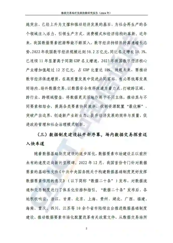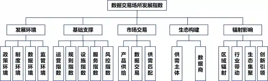 报告紧扣数据要素价值化主线,深入分析国内外数据交易场所发展现状和趋势,系统剖析我国数据交易场所发展面临的机遇和挑战,并在贵阳大数据交易所的大力支持下,遵循国家政策导向、实践导向、发展需求导向和问题导向,从构建规范高效的数据交易场所入手,围绕发展环境、基础支撑、市场交易、生态构建、辐射影响五个维度,研究建立了数据交易场所发展指数体系1.0,希望能为各级数据管理机构和产业界相关方推进数据交易高质量发展提供有价值的参考。报告中提到数据交易场所发展指数构建。发展指数共设置发展环境、基础支撑、市场交易、生态构建、辐射影响5个一级指标、18个二级指标、50余个三级指标。