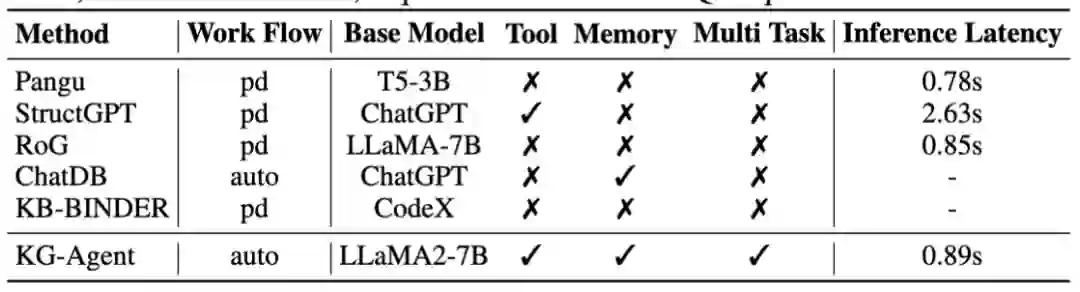 表1 KG-Agent与各类方法对比为了解决这些问题,本文提出了 KG-Agent,这是一种基于大型语言模型(LLM)的自主代理框架,用于对知识图谱(KG)进行复杂推理任务。其动机有两方面:1. 设计自主推理方法,使其在推理过程中能够主动做出决策,无需人工干预;2. 使相对较小的模型(例如7B LLM)能够有效执行复杂推理任务,而无需依赖封闭源代码的 LLM API。 为实现这一目标,我们的方法在技术上有三大贡献:1. 我们通过策划一个多功能工具箱扩展了 LLM 操作结构化数据的能力,使LLM能够对 KG 数据和中间结果执行离散或高级操作(例如过滤、计数和检索)。2. 我们利用现有的 KG 推理数据集合成基于代码的指令数据来微调 LLM,首先根据 KG 上的推理链生成程序,然后合成指令数据。 3. 我们提出了一种基于工具选择和记忆更新的自主迭代机制,将微调后的 LLM、多功能工具箱、基于 KG 的执行器和知识记忆结合起来,实现对 KG 我们在领域内和领域外任务上进行了广泛的评估(例如基于知识图谱的问题回答(KGQA) 和开放域问题回答(ODQA)),验证了我们的 KG-Agent 的有效性。我们将我们的贡献和结果总结如下:1. 自主和通用的 KG Agent:据我们所知,KG-Agent是第一个使用相对较小的 LLM(7B)开发自主代理的方法。2. 高效的训练和推理:KG-Agent 仅在10K个样本上进行训练 (例如 GrailQA 的22.6%),并具有较低的推理延迟 (例如相比于 StructGPT,推理速度几乎提高了3倍)。 3. 高效的训练和推理:KG-Agent 仅在10K个样本上进行训练 (例如 GrailQA 的22.6%),并具有较低的推理延迟 (例如相比于 StructGPT,推理速度几乎提高了3倍)。