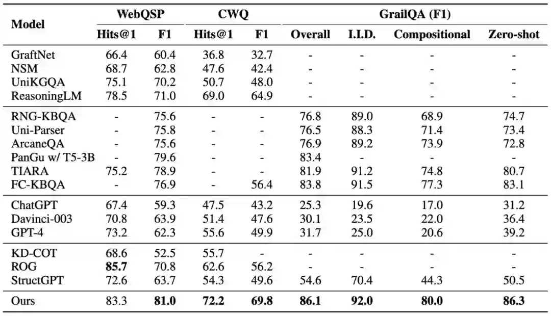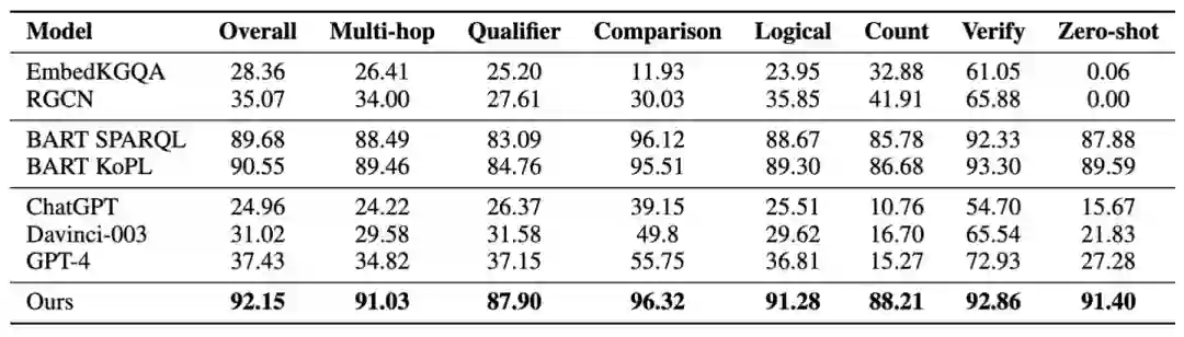 表3 在基于Wikidata的数据集上的结果 经过指令微调后,我们直接在跨领域数据集上评估了我们的 KG-Agent 的零样本性能。如表4所示,尽管使用完整数据进行了微调,小型预训练语言模型(例如T5和BART)无法有效回答这些事实性问题。由于参数规模较大,Davinci-003 和 ChatGPT 在 NQ 和 TQ 上的表现良好,这些数据集是基于它们可能已经预训练过的维基百科构建的。然而,它们在基于Freebase KG构建的WQ上的表现不佳。相比之下,我们的 KG-Agent 只需学习如何与KG交互,而不需要记住特定的知识。因此,它可以在零样本设置中利用外部KG,并且与微调后的预训练语言模型相比,实现了持续的改进。
