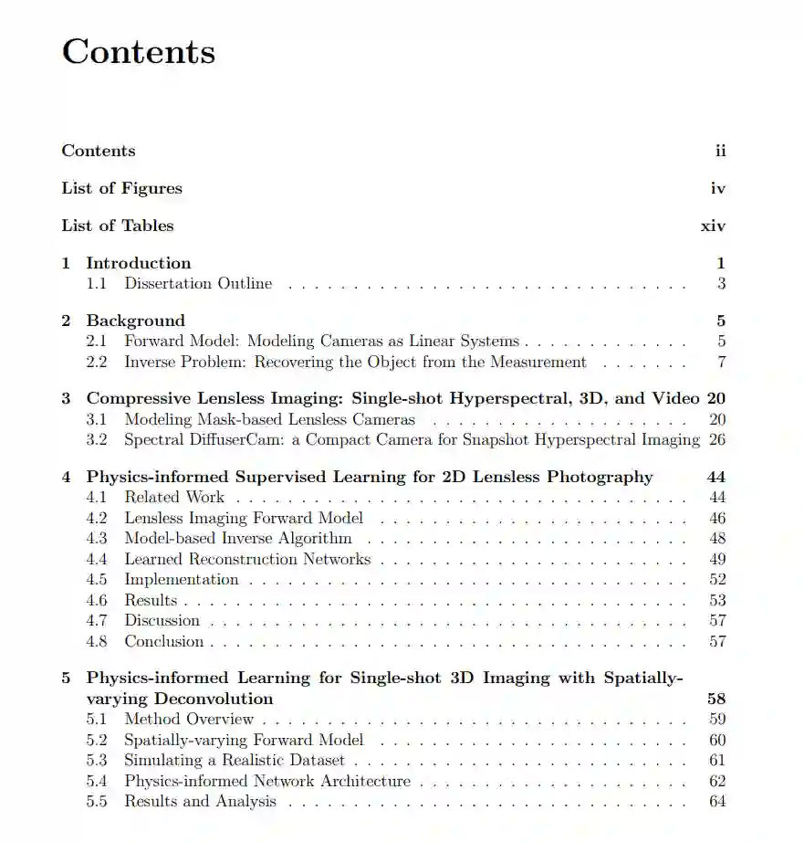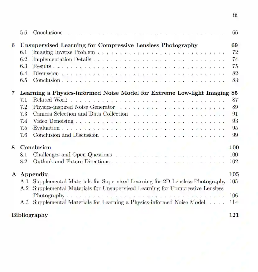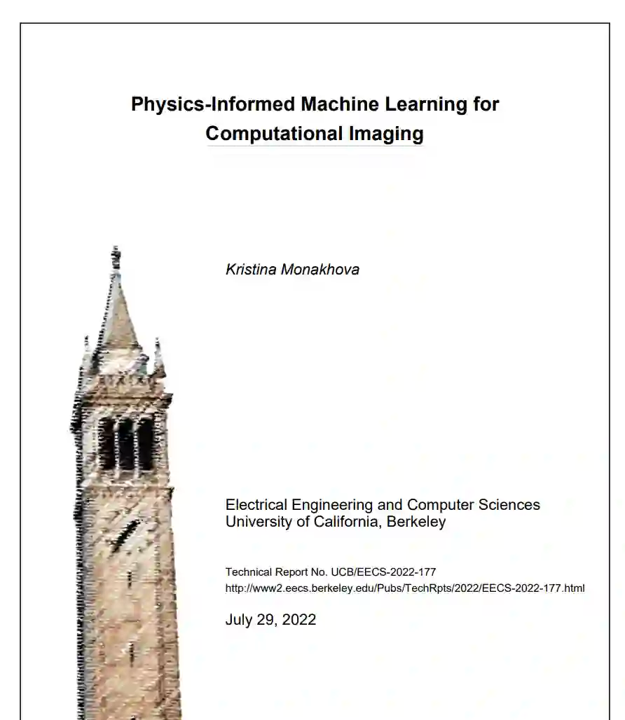 从压缩相机到弱光摄影,许多计算成像系统的一个关键方面是用于从编码或噪声测量中发现信号的算法。一些计算相机将高维信息(例如不同波长的光、3D、时间)编码到二维传感器上,然后使用算法解码和恢复这种高维信息。另一些捕获的测量值极具噪声或退化,需要算法来提取信号并使图像可供人们使用,或供更高级别的下游算法使用。在每种情况下,用于解码和从原始测量中提取信息的算法对于使计算摄像机发挥作用至关重要和必要。多年来,从计算摄像机中恢复信息的主要方法,经典方法都是基于最小化由数据项和精心挑选的先验项组成的优化问题。最近,深度学习已被应用于这些问题,但往往无法纳入已知的光学特性,需要大型训练数据集,并导致无法轻松解释的黑盒模型。本文提出基于物理信息的机器学习的计算成像,这是一种将经典方法的元素与深度学习相结合的中间方法。本文展示了如何将成像系统物理学的知识纳入神经网络,以提高图像质量和性能,超出几个计算相机的经典或深度方法的可行性。本文展示了几种将成像物理纳入神经网络的不同方法,包括算法展开、可微光学模型、无监督方法以及通过生成式对抗网络。对于这些方法中的每一种,都专注于具有独特挑战和建模考虑的不同计算相机。引入了一个展开的、基于物理的网络,提高了无镜头相机的质量和重建时间,改善了这些相机,并在各种场景中显示出逼真的图像质量。在此基础上,本文展示了一种新的重建网络,可以将具有空间变化模糊度的压缩单次3D显微镜的重建时间提高1600倍,从而实现场景的交互式预览。在难以获得训练数据的情况下,未经训练的物理信息网络可以提高压缩单次视频和高光谱成像的图像质量,而不需要训练数据。设计了一种物理信息噪声发生器,可以在极高增益、低照度设置下真实地合成噪声。使用这个学习到的噪声模型,我们展示了如何推动相机超过其典型的极限,并首次在星光级别的照明下拍摄逼真的视频。每个案例都强调了使用基于物理学的机器学习如何改善计算相机并将其推向极限。