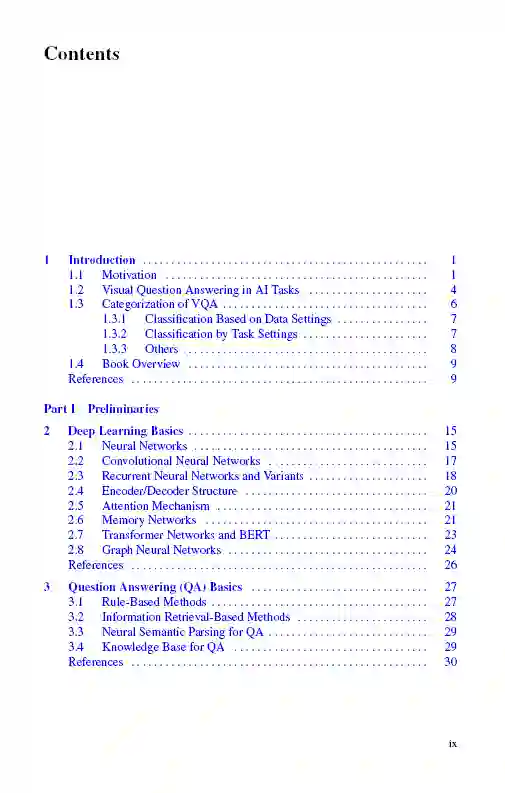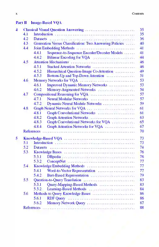 这本书提供了VQA的全面概述,包括基本理论,模型,数据集,和有前途的未来方向。考虑到它的范围,它可以作为一本关于计算机视觉和自然语言处理的教科书,特别是对于研究人员和学生在视觉问题回答领域。它还强调了VQA中使用的关键模型。