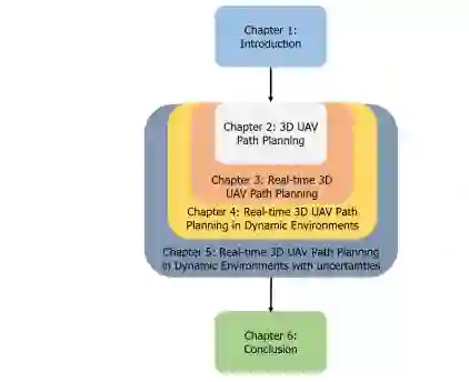 在本论文中,每个研究问题都建立在前一个的基础上,以这种方式达成最终研究目标并应对研究挑战。在评估每种算法的路径规划性能(研究目标的第一部分)过程中,可以独立分析每种方法对每个额外复杂因素的响应。这些知识可用于指导未来的无人机设计者根据其应用选择最佳配置,从而达到研究目标的第二部分。