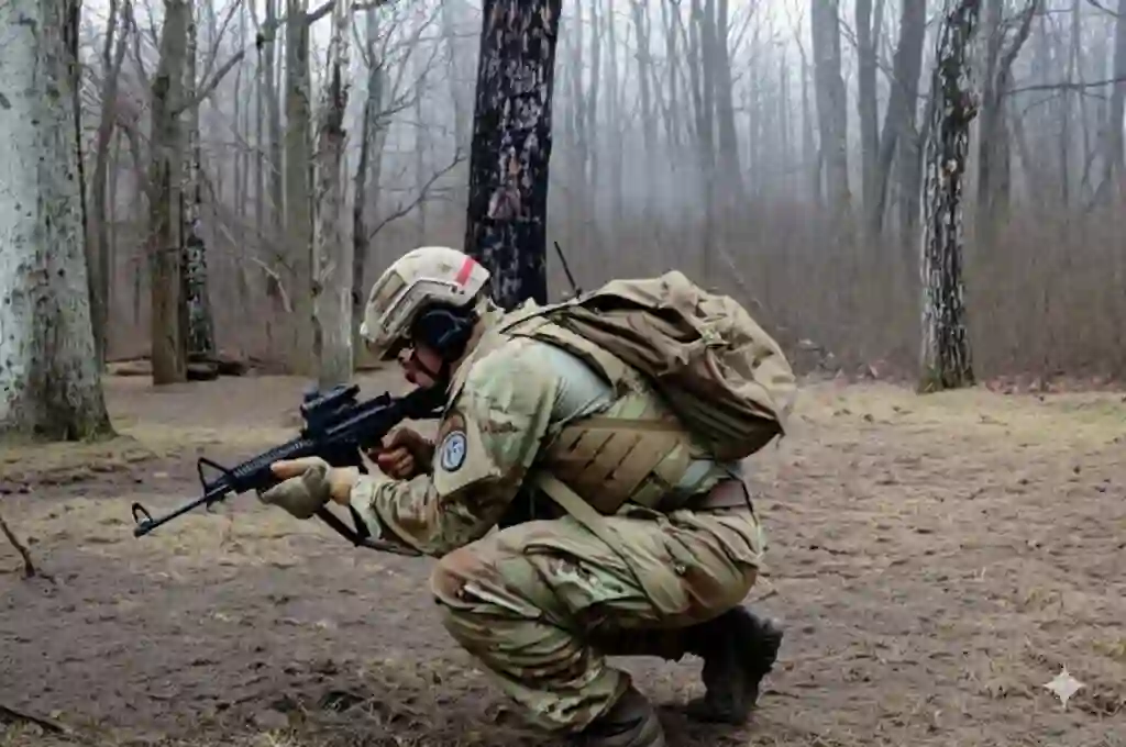 图示:丛林环境中蹲伏的士兵,突显复杂地形对视觉侦察的限制