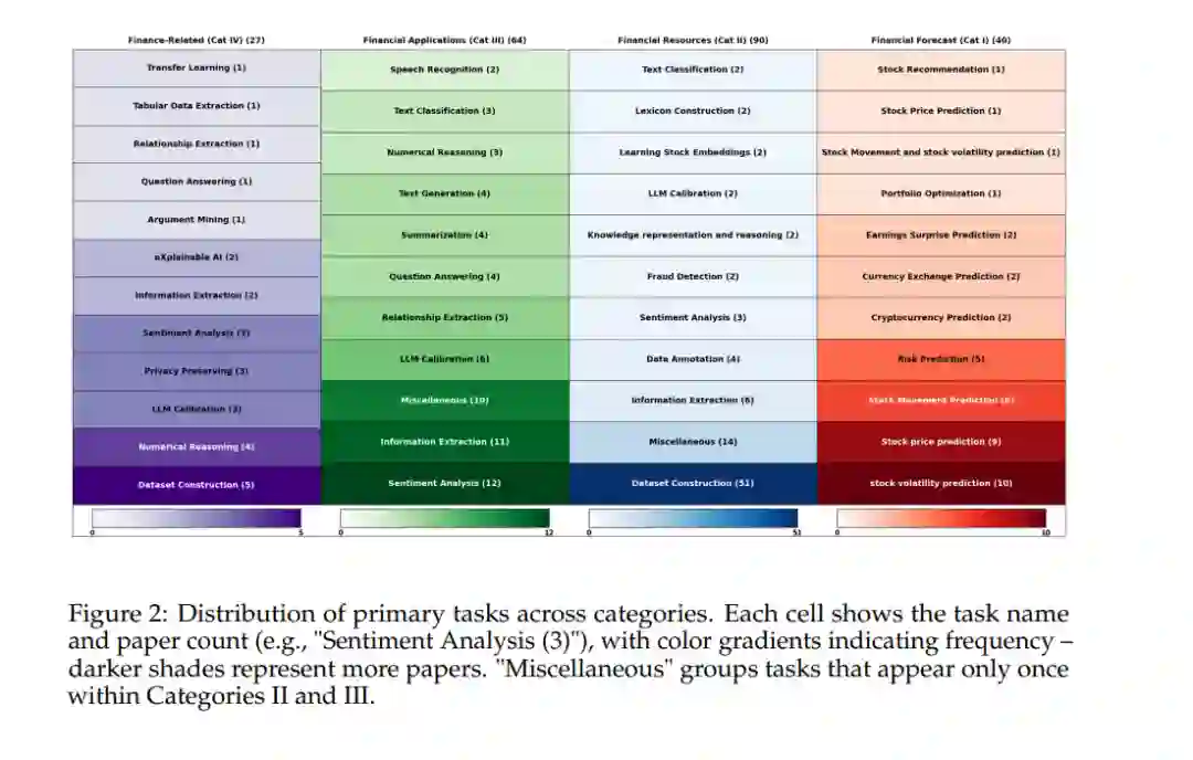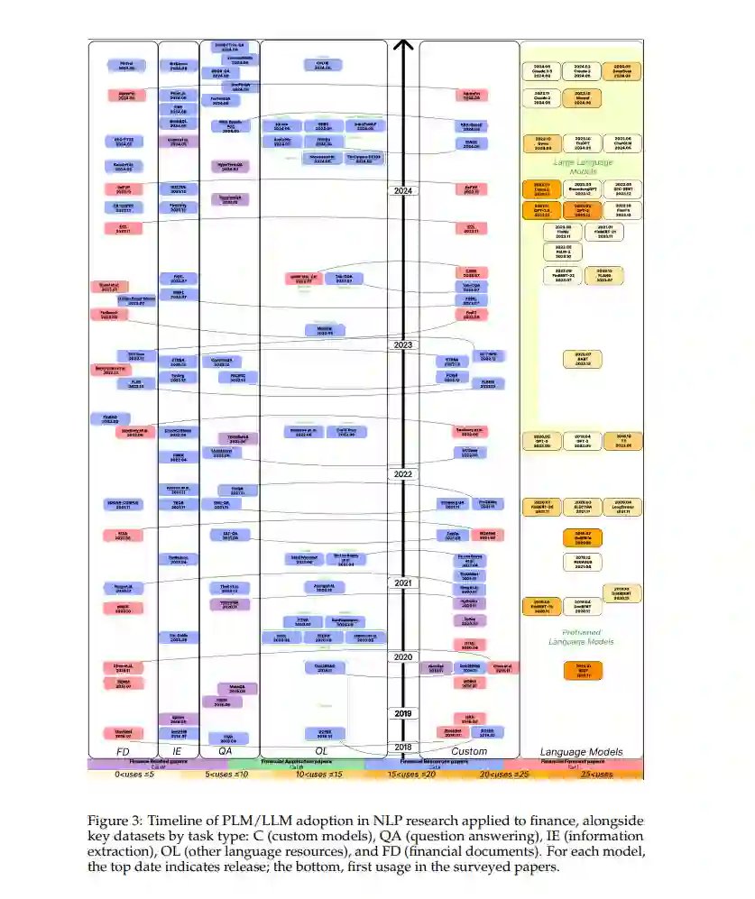 语言建模已成为自然语言处理(NLP)中的关键工具,广泛应用于分析非结构化文本,如报告、新闻文章和社交媒体帖子。这些方法正日益被用于处理金融相关任务,例如情感分析(Balakrishnan 等,2022)、信息抽取(Huang 等,2023)、摘要生成(Khanna 等,2022)、股票预测(Jain 与 Agrawal,2024)以及波动率预测(Niu 等,2023)。随着越来越多的 NLP 研究论文聚焦于金融问题,有必要系统地审视该领域对金融应用的贡献。
