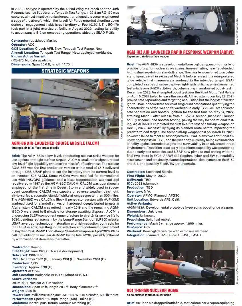 B-21 "突袭者 "是一种发展型、穿透性攻击轰炸机,计划用于投掷常规弹药和核弹药。这种低可观察飞行翼设计被命名为 "突袭者",以纪念二战中于 1942 年 4 月突袭日本的杜立特突袭队。虽然外形与 B-2 相似,但 B-21 具有更深的发动机进气道凹槽、双轮主起落架、独特的梯形挡风玻璃和更先进的低可观察性设计。空军于2015年授予诺斯罗普-格鲁曼公司远程攻击轰炸机合同,旨在利用现代系统和材料研制一种经济实惠的下一代隐形轰炸机。该机型是美国空军自1988年推出B-2 "精神 "轰炸机以来首次设计的新型轰炸机,计划与现代化的B-52J一起成为战略机队的主力。美国空军正在研制的 B-21 是 "系统家族 "的一部分,包括互补的 ISR、C2 和电子战平台和能力,旨在提高在高端威胁环境中的生存能力。诺斯罗普-格鲁曼公司正在采用数字化设计技术,以快速适应变化和加快交付,并采用开放式系统结构,以方便未来的升级和现代化。名义核军备包括计划中的远程对峙(LRSO)导弹和 B61-12 制导自由落体武器,以及一系列先进的常规武器。AFGSC 计划购买至少 100 架 B-21 战斗机,从 2020 年代中期开始交付。同时开发和低速初始生产的目的是从 23 财政年度的第一批开始,加速交付。低速初始生产将包括五个批次的 21 架飞机,随后最快在 25 财年进行全速生产。在诺斯罗普-格鲁曼公司位于加利福尼亚州帕姆代尔的工厂,至少有6架飞机正在生产中,首架飞机于2022年12月2日在该工厂举行了公开揭幕仪式。首架飞机将在帕姆代尔完成地面测试和滑行试验,然后进行首飞。美国空军推迟了首飞时间,以确保设计成熟,但仍计划在2023年将飞机交付爱德华兹,以继续开发和进行飞行测试。初始作战飞机将交付给位于埃尔斯沃思的美国空军总参谋部正式训练和作战单元,随后交付给惠特曼和戴斯。
