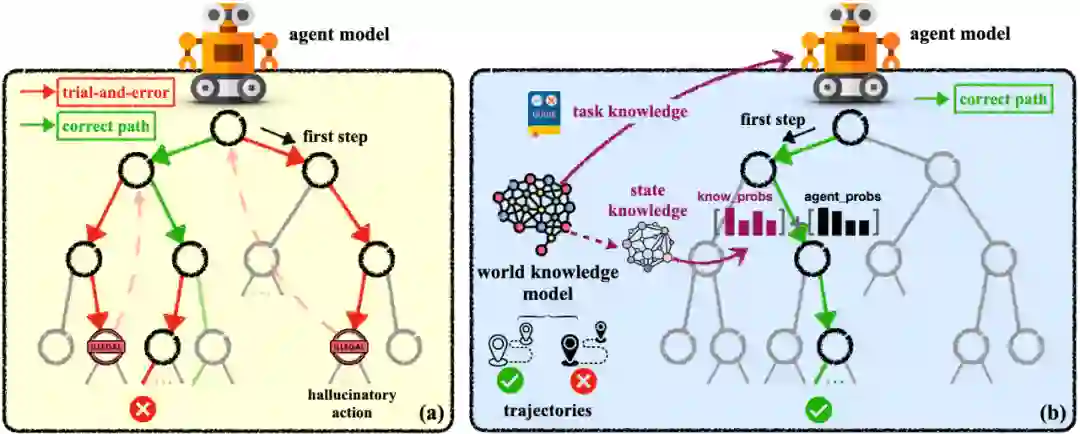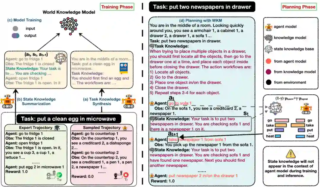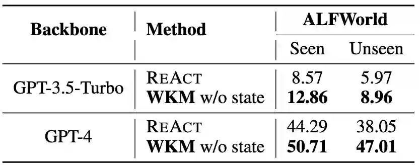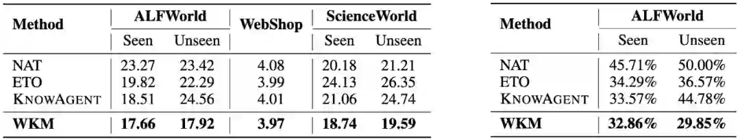 在三个复杂的真实世界模拟数据集(ALFWorld、WebShop、ScienceWorld)和三种SOTA开源模型(Mistral-7B、Gemma-7B和Llama-3-8B)上的实验结果表明,世界知识模型增强的智能体可以实现更好的性能。此外,我们分析了知识模型能够有效缓解智能体盲目试错和幻觉行为问题。其他有趣的发现包括:1)我们的实例级任务知识能够更好地泛化到未见过的任务;2)小的世界知识模型可以有效地指导更强大的智能体进行规划;3)统一的世界知识模型训练具有进一步发展的潜力。