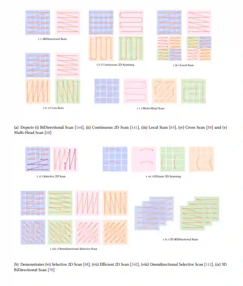 注意力机制,尤其是自注意力机制,具有平方级的时间复杂度,导致计算成本随序列长度呈平方增长。相比之下,扫描操作通常具有线性时间复杂度,因此在处理长序列时效率更高。扫描操作涉及计算一个数组(如前缀和),其中每个值由之前计算的值和当前输入决定。类似地,SSM 的递归形式可以视为一种扫描操作。扫描是 Mamba 的一个关键组件,特别是在处理多维输入时。Mamba 模型中扫描机制的选择至关重要,因为它提高了效率并提供了重要的信息。图 15 以可视化的形式展示了 Mamba 架构中采用的各种扫描机制,该可视化突显了集成到 Mamba 模型中的多种扫描方法的多样性。表 1 总结了各种扫描机制及其相关模型。