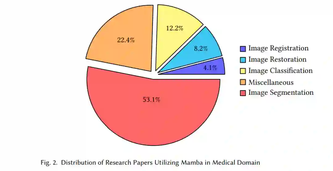 一些 CNN 的缺点通过 transformer 架构 [107, 124] 得到缓解,这类技术在序列数据处理和长程依赖方面表现更优。然而,transformer 也存在一些不足。主要问题是计算注意力的规模随着序列长度呈平方增长,因此在处理非常长的序列时会导致高昂的计算成本。此外,通常需要更多的资源和数据,这在资源受限的环境中(如医学领域)是一个难题。针对传统 CNN 和 transformer 的不足,许多研究探索了可以有效表示长序列及其复杂依赖关系的不同模型。近年来,状态空间模型(SSM)[47] 引起了广泛关注,Mamba [45] 模型便是其中之一。Mamba 旨在解决现代深度学习技术中的相关问题。它利用选择性状态空间来快速处理长序列,结合多种模式,并支持高效的分辨率和实用性。Mamba 的架构整合了选择性扫描机制和硬件感知算法,从而在中间结果的存储和计算方面实现高效率。这样使得 Mamba 在一些需要长程依赖和高复杂度的任务(如医学图像分割 [128, 134, 138]、分类 [44, 99, 150]、合成、配准和重建 [62, 83, 162])中表现优异。 Mamba 在生物医学领域表现出色,特别是在生物医学成像、基因组学和临床记录处理领域。因此,该模型在涉及长程和多模态数据的任务中表现出色,能够捕获信息单元之间的微妙关系和依赖性。图 1 展示了 Mamba 随时间演变的时间线,从 HiPPO [46] 和线性状态空间层(LSSL)[49]、S4 [47]、对角状态空间(DSS)[51]、S4D [48]、S5 [113]、S4ND [100]、Hungry Hungry Hippos(H3)[42] 到 Mamba [45]。其中还包括随着模型演进产生的 Mamba 变体。图 2 所示的饼图展示了使用 Mamba 框架在医学领域各项任务中的研究论文分布,分为五个部分,每个部分代表特定任务及其在总论文数中的比例。此外,图 3 展示了 2023 年 12 月至 2024 年 9 月期间 Mamba 在医学领域相关出版物数量的波动,研究活动在 2024 年 3 月和 4 月明显激增。 目前有几篇关于 Mamba 的综述性论文。然而,这些论文可能做了以下之一的选择——要么 [101, 104] 广泛覆盖框架,要么仅限于视觉领域的应用 [87, 140, 153]。值得注意的是,只有 [56] 对 Mamba 在医学领域的应用进行了评审。然而,我们的综述论文比 [56] 更为全面和详细。特别是,本文重点分析了医学数据集等公共资源,并提供了一些关于 Mamba 在医学实践中应用的实验数据,包括在医疗环境中 Mamba 可用的各种资源和干预措施。此外,我们还包括了 Mamba 架构在医学图像分析领域的最新研究和发展。我们以一种便于读者理解的结构组织了本文,帮助他们认识 Mamba 在医学领域的组织框架,包括其优势、劣势和前景。 在本综述中,我们关注医学领域内 Mamba 状态空间模型的使用、方法和问题。我们提供了该研究方向的现状概述,重点讨论了 Mamba 模型的优缺点及其未来前景。本文余下部分的结构如下:第 2 节讨论了与 SSM 相关的关键术语,第 3.1 节介绍了不同的 Mamba 架构。第 3.3 节讨论了若干 Mamba 优化,第 3.4 节解释了弱监督、半监督、自监督、对比学习和多模态学习等技术。第 3.2 节讨论了 Mamba 中的不同扫描机制,第 3.5 节介绍了各个领域中的应用。数据集概述见第 4 节。第 5 节讨论了展示 Mamba 在不同任务中表现的实验结果。第 6 节解释了 Mamba 的局限性和新兴领域,最后在第 7 节中提出了未来发展方向并总结了本文的研究。