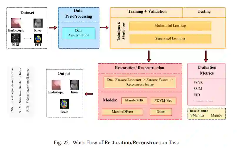 恢复(Restoration)是医学成像中的一种应用,用于改善因噪声、低分辨率和模糊等因素而受损或失真的图像质量。重建(Reconstruction)是一种将原始医学数据转换为目标图像的数学过程。表 5 概述了应用于医学图像恢复/重建的基于 Mamba 的模型,包括参数、描述及代码可用性。图 22 展示了基于 Mamba 的模型在医学图像恢复/重建任务中的工作流程。