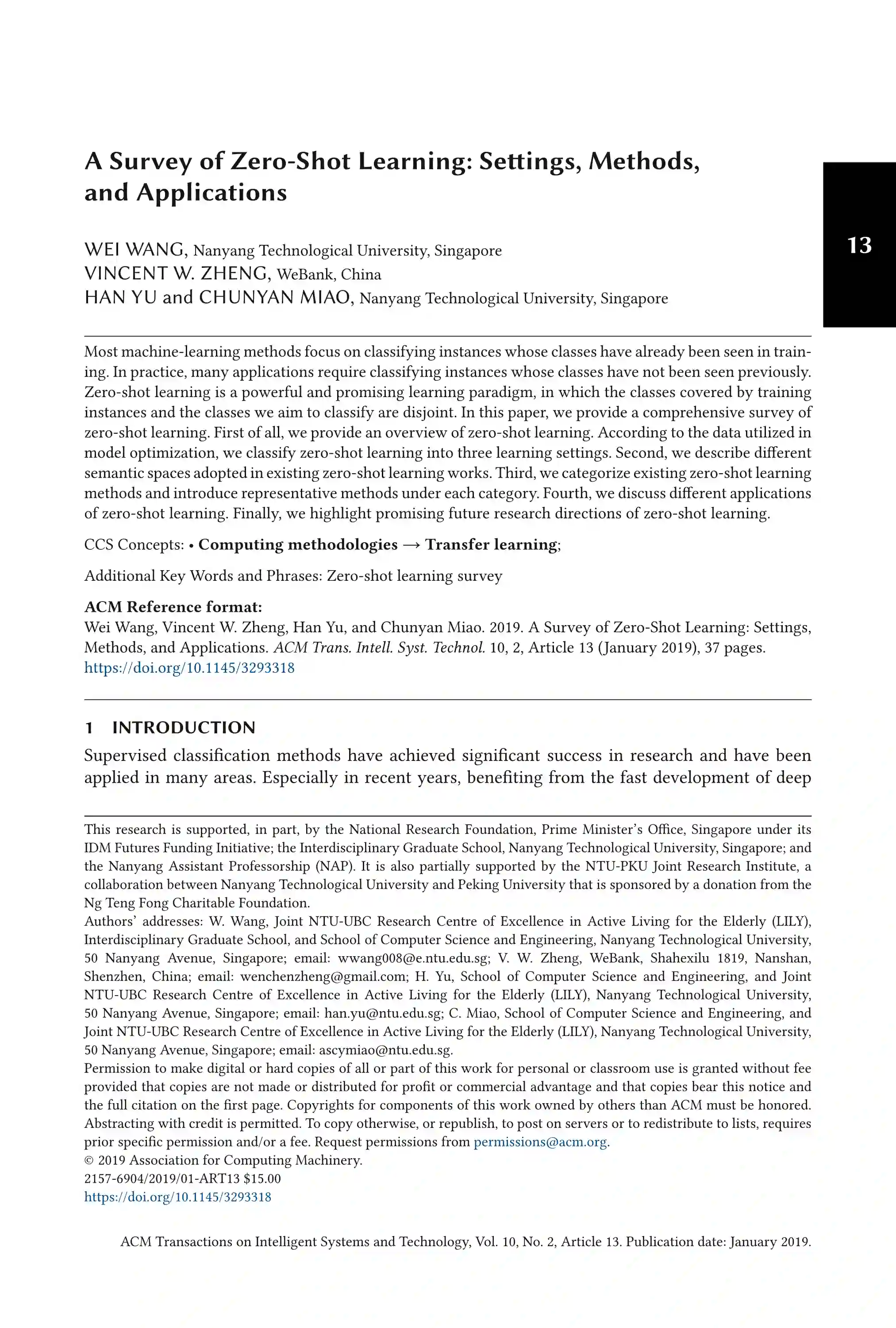 近年来,零样本学习(ZSL,zero-shot learning)已经在大量的任务中受到了广泛的关注。大多数机器学习方法,均侧重于那些训练集中广泛存在的样本进行分类。但现实场景中,许多的任务需要对从未见过的样本进行分类。零样本学习是一种非常强大的学习范式,本篇综述,首先,概述了零样本学习,根据学习过程中使用到的数据模型,我们将其划分为三种学习类型;第二,描述了零样本学习过程中所采用的不同语义空间;第三,对现有零样本学习方法进行了分类,并在每个类别下介绍了具有代表性的方法;第四,讨论了零样本学习的不同应用方向;最后,我们介绍了零样本学习的未来研究方向。