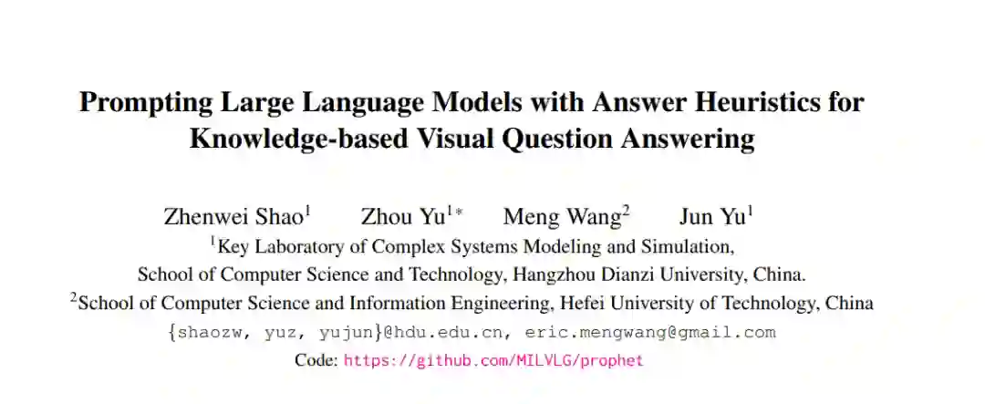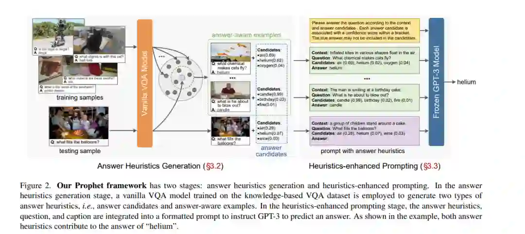 基于知识的视觉问答(VQA)需要图像以外的外部知识来回答问题。早期的研究从显式知识库(KBs)中检索所需的知识,但这些知识往往会引入与问题无关的信息,从而限制了模型的性能。最近的工作试图使用大型语言模型(即GPT-3[3])作为隐式知识引擎,以获取必要的知识进行回答。尽管这些方法取得了令人鼓舞的结果,但由于提供的输入信息不足,它们并没有充分激活GPT-3的能力。**本文提出prophet——一个概念简单的框架,旨在用答案启发式方法提示GPT-3进行基于知识的VQA。**首先,在没有外部知识的情况下,在特定的基于知识的VQA数据集上训练了一个普通的VQA模型。然后,从模型中抽取两类互补答案启发:答案候选和答案感知示例。最后,将两类答案启发编码到提示信息中,使GPT-3能够更好地理解任务,从而提高其能力。Prophet在两个具有挑战性的基于知识的VQA数据集OK-VQA和A-OKVQA上明显优于所有现有的最先进方法,在它们的测试集上分别取得了61.1%和55.7%的准确率。