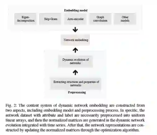 现实世界的网络由各种相互作用和不断发展的实体组成,而大多数现有研究只是将它们描述为特定的静态网络,而没有考虑动态网络的发展趋势。近来,在跟踪动态网络特性方面取得了重大进展,它利用网络中实体和链接的变化来设计网络嵌入技术。与静态网络嵌入方法相比,动态网络嵌入致力于将节点编码为低维密集表示形式,从而有效地保留了网络结构和时间动态特性,这对众多下游机器学习任务是有益的。在本文中,我们对动态网络嵌入进行了系统的调查。特别是,描述了动态网络嵌入的基本概念,特别是,我们首次提出了一种基于现有动态网络嵌入技术的新分类法,包括基于矩阵分解的方法,基于Skip-Gram的方法,基于自动编码器,基于神经网络和其他嵌入方法。此外,我们仔细总结了常用的数据集以及动态网络嵌入可以带来的各种后续任务。之后,我们提出了现有算法面临的几个挑战,并概述了促进未来研究的可能方向,例如动态嵌入模型,大规模动态网络,异构动态网络,动态属性网络,面向任务的动态网络嵌入和更多的嵌入空间。