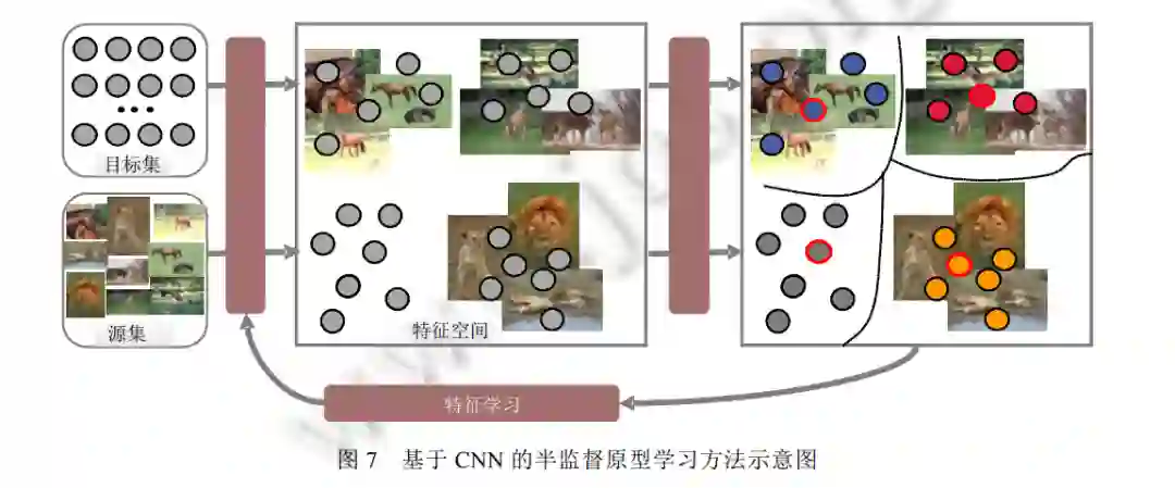 原型质量与原型学习模型可利用的信息量成正比关系. 显然, 提供的信息越多, 获取的原型越能更好地 捕获目标数据的分布. 然而, 现有的原型学习只利用有限的目标数据且无任何监督信息, 这必然会弱化原型 的可解释性. 为了充分利用大数据时代已标注的海量数据资源, 未来工作应沿着跨域引入辅助集的方向探索, 而非传统的监督式原型学习[119,120]. 但同时, 尽可能约简与目标集相关的假设和先验知识, 以增加其适用范 围. 例如, 为了将训练好的复杂模型的“知识”迁移到一个结构更为简单的小型网络中, 进而方便模型部署, Hinton 等人曾提出了蒸馏网络模型[121]. 受该模型启发, 文献[122]提出了数据蒸馏的概念: 保持模型固定, 尝 试将大型训练数据集中的知识提炼成小数据. 其中, 这些合成的少量数据不需要一定来自正确的数据分布, 但当作为模型的训练数据学习时, 能达到近似在原始数据上训练的效果. 未来, 是否可以将模型蒸馏和数据 蒸馏进行融合以进行原型学习十分值得探讨. 其核心思想是: 利用一个额外的有标记的辅助数据集, 即使其 语义标签集合与目标数据集的语义标签集合没有任何交集, 但通过模型知识蒸馏并迁移到目标数据集, 可以 生成一个小规模的原型集. 这样不仅可以描述目标数据集的分布, 还可以泛化到其他数据集, 并对其进行分 类、预测等多种推理任务. 以一个小样本学习的任务为例: 为了识别“犀牛”和“斑马”这两个物种, 专家分别标 注了 5 个样本. 从如此极少量样本中快速学习一个分类模型, k 近邻分类器固然可行, 但是如若可以利用庞大的已标注的数据集以及预训练模型(比如 ImageNet 数据集中的“黄牛”和“白马”)进行知识迁移, 以更加全面地 学习“犀牛”和“斑马”的原型, 进而利用原型进行 k 近邻分类, 那么性能在一定程度会得以提升.